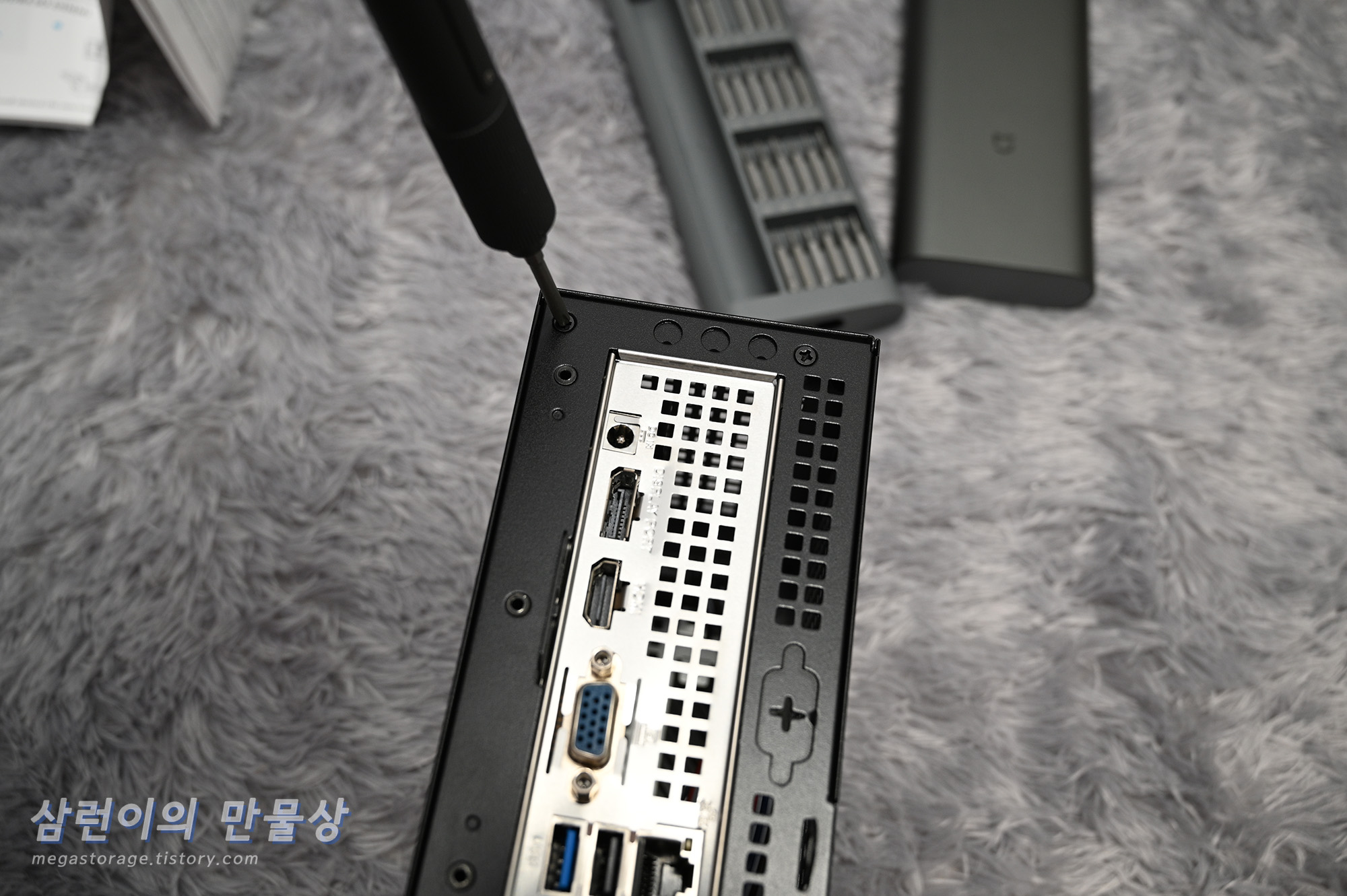 케이스 우측에는 VESA 킷을 부착할 수 있는 나사 구멍이 있습니다.