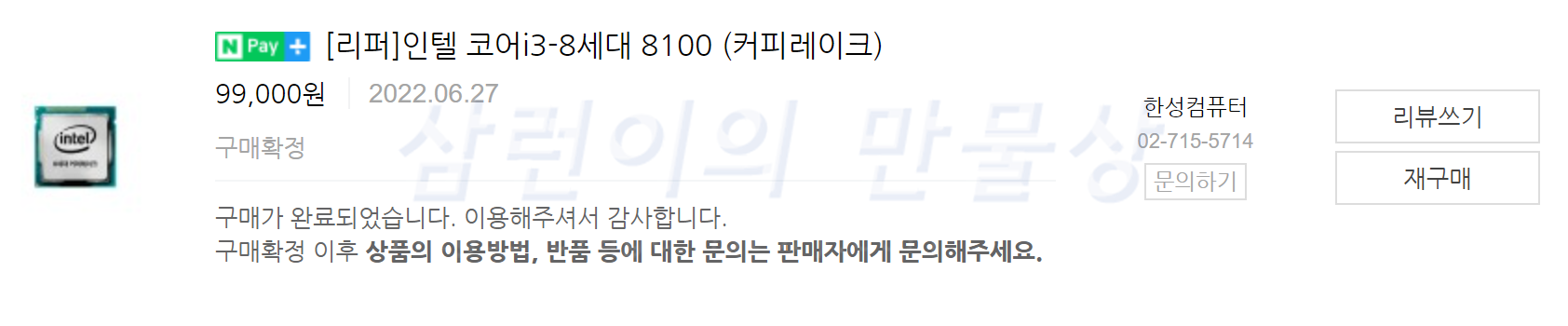 CPU는 한성컴퓨터 쇼핑몰에서 i3-8100을 리퍼 제품으로 구입했습니다. CPU는 고장날 확률이 적고 A/S 받을 일이 없으니까요.