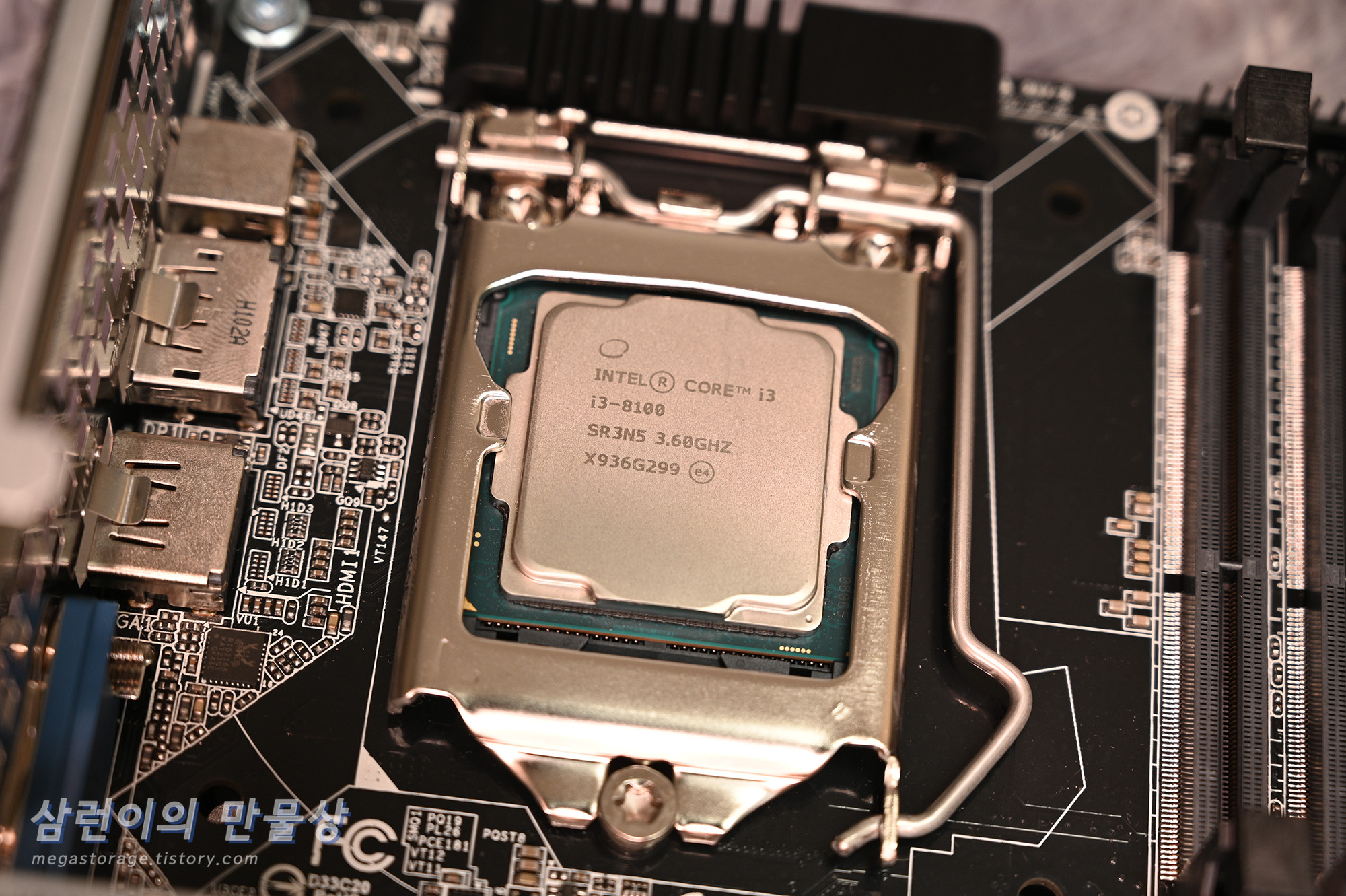 CPU는 인텔 i3-8100입니다. 벌크 모델이 아닌 단순 리퍼 모델이라서 CPU 표면에 낙인 마크 같은 것은 없습니다.