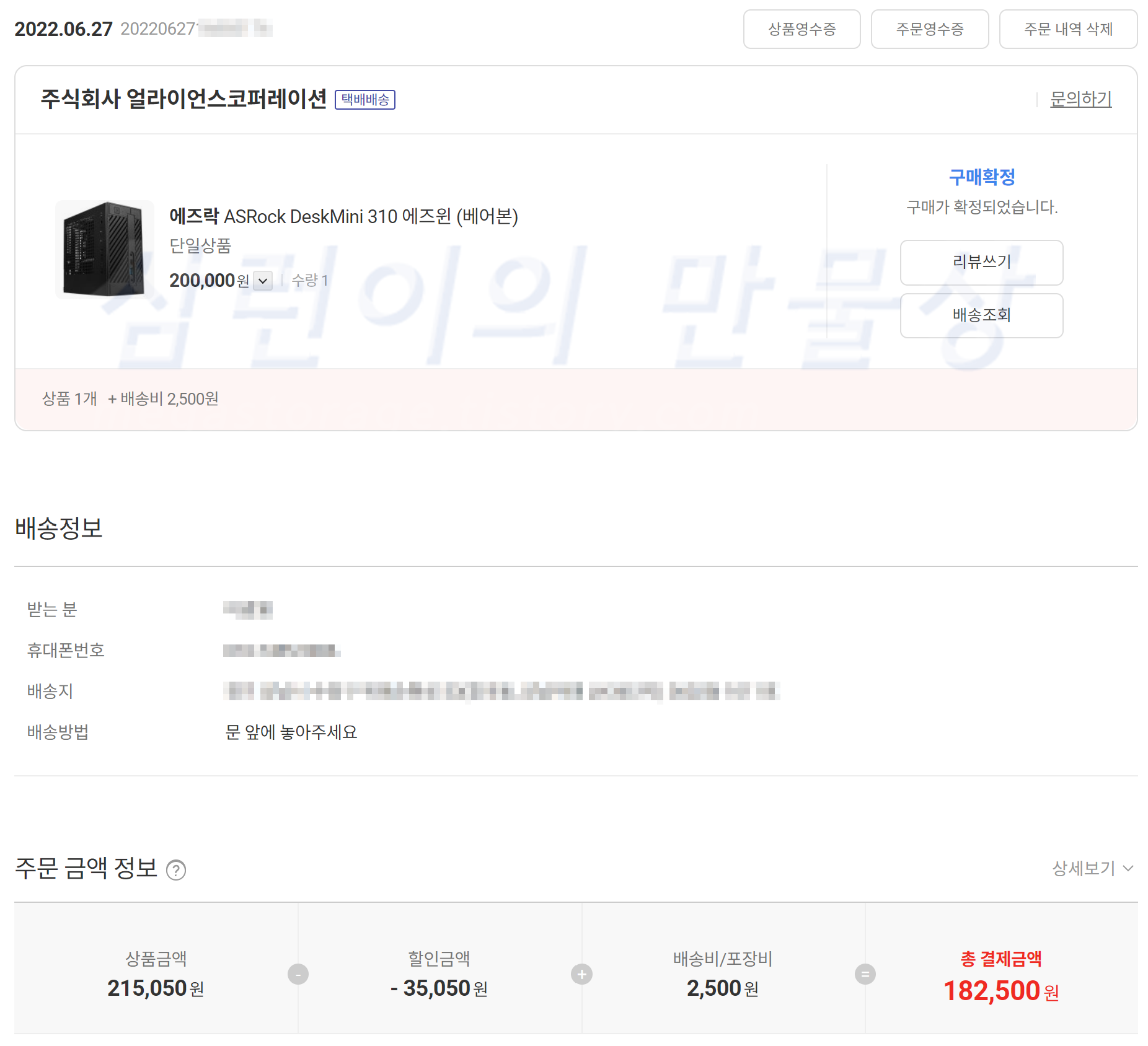 ASRock DeskMini 310은 롯데온에서 18만원 (+택배비 2,500원 별도)에 구입했습니다.