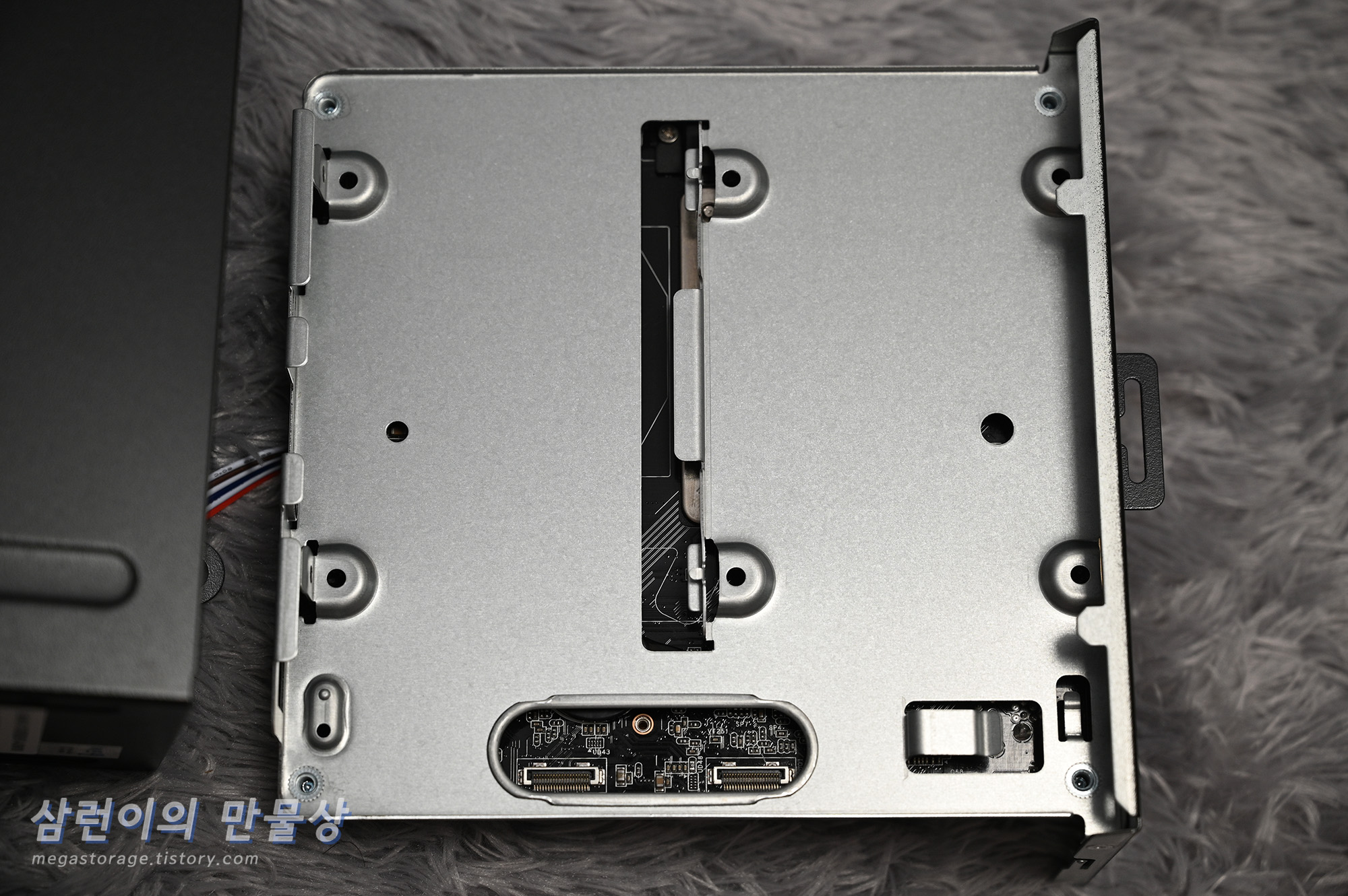 메인보드의 후면에는 2.5인치 HDD 또는 SSD를 장착할 수 있는 슬롯 2개와 SATA 케이블을 장착할 수 있는 포트 2개가 있습니다.