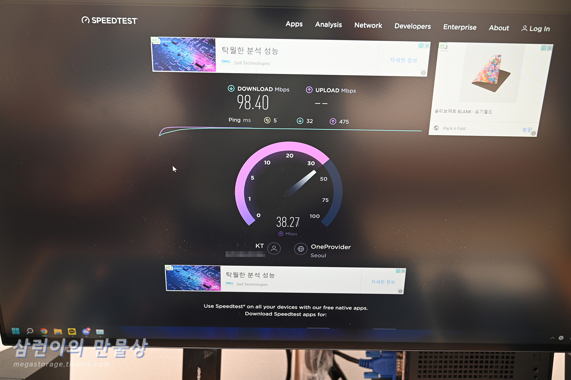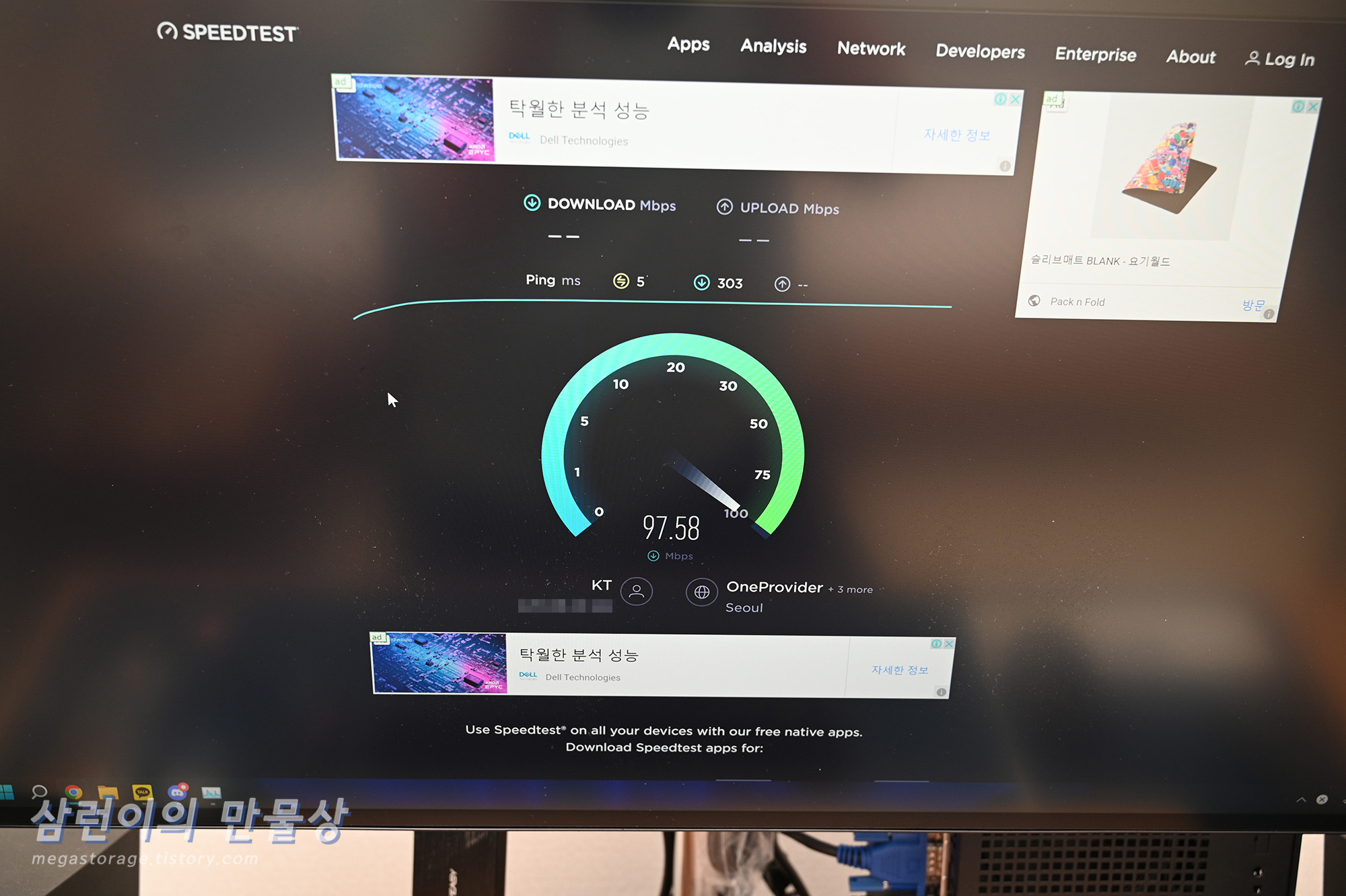 안테나를 설치하지 않은 상태에서 무선 인터넷 속도 측정을 했는데.. 오..?? AX200 무선랜의 성능이 어마어마합니다. 다운로드 속도가 무려 100Mbps씩이나 나옵니다. 안테나만 설치해주면 500Mbps 인터넷 속도 다 나오겠네요. 신기합니다.