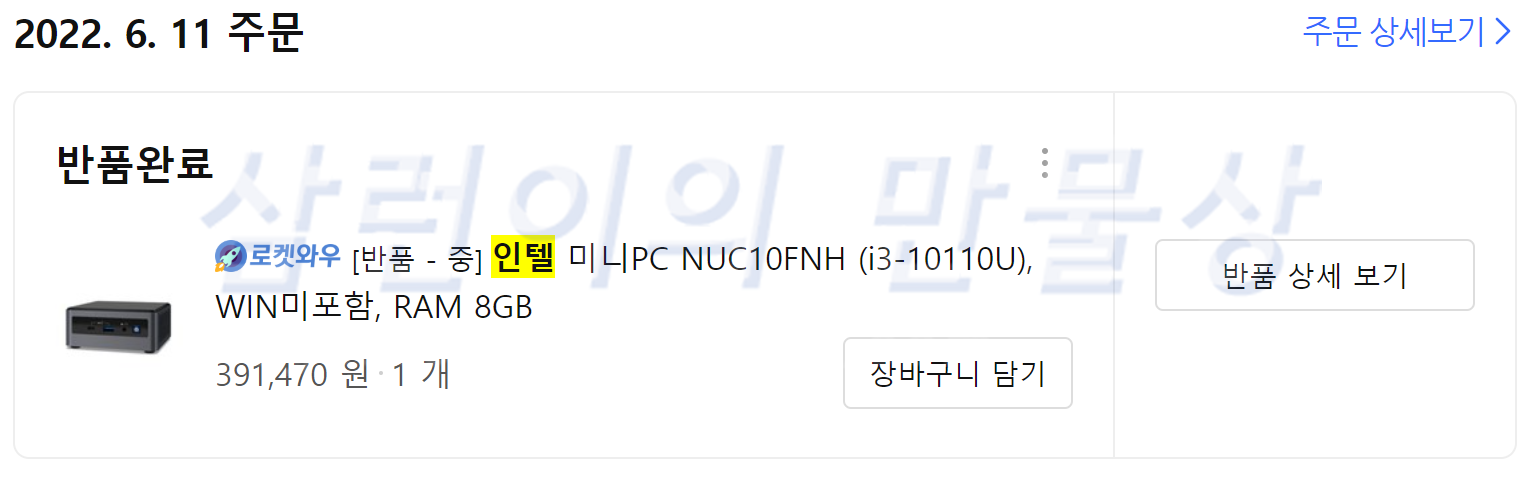 집에서 사용할 수 있는 PC는 Z13 하나 뿐이었기 때문에, 최장 한 달로 예상되는 A/S 기간 동안에 사용할 PC가 필요했습니다. 그렇다고 이 기간동안에만 사용 할 PC를 구하려는 것은 아니고, 사양이 그리 높진 않지만 무난하게 사용할 수 있는 PC면 되었습니다. 그래서 쿠팡에서 저사양 미니 PC를 구입하게 됩니다. 바로 인텔 NUC에서 i3-10110U가 탑재된 NUC10FNH 입니다.