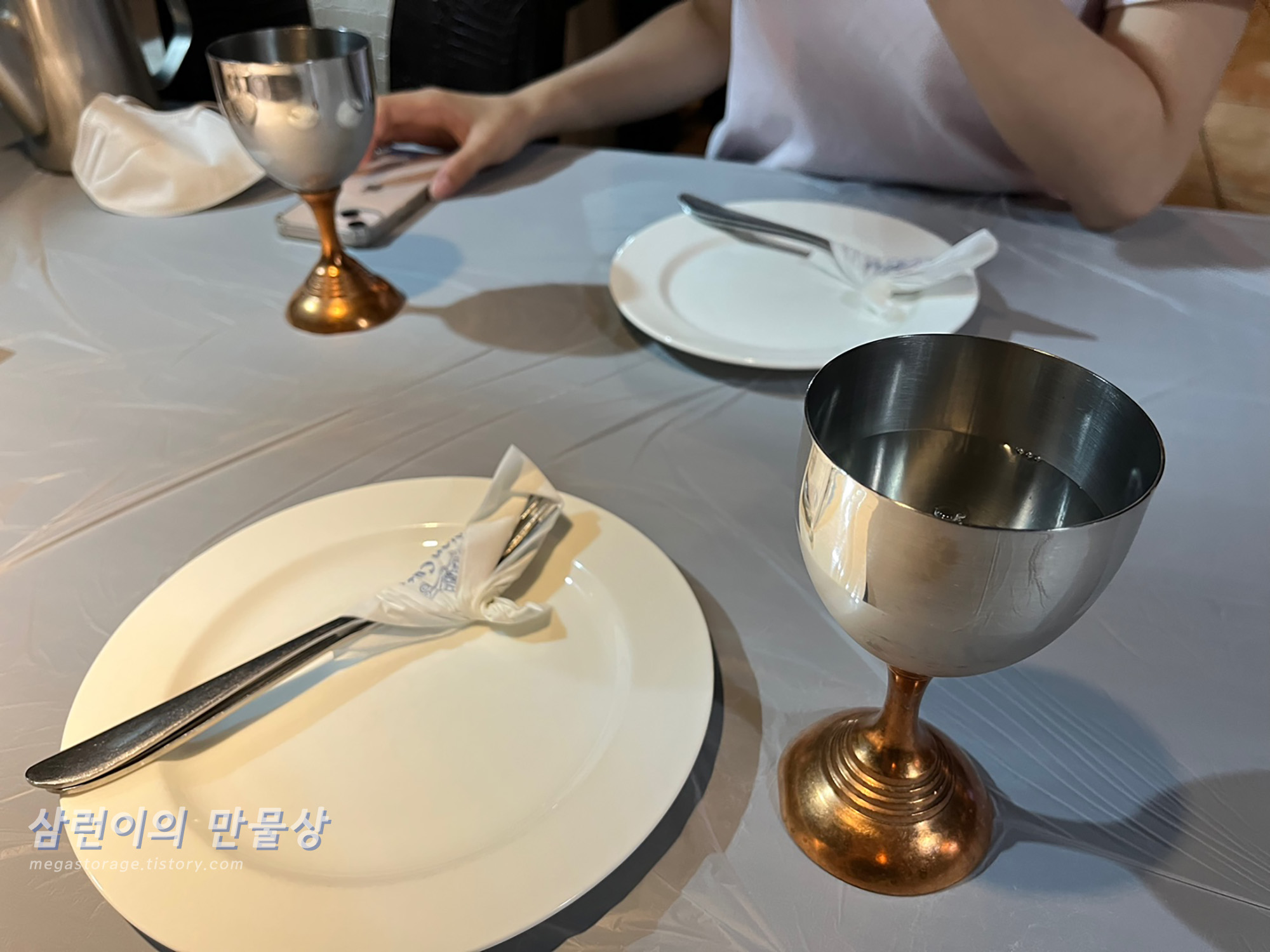 물잔이 ㅋㅋㅋ 유리잔이 아니라 와인잔 같은 잔입니다. 물 마시는데도 고급스러운 느낌이...