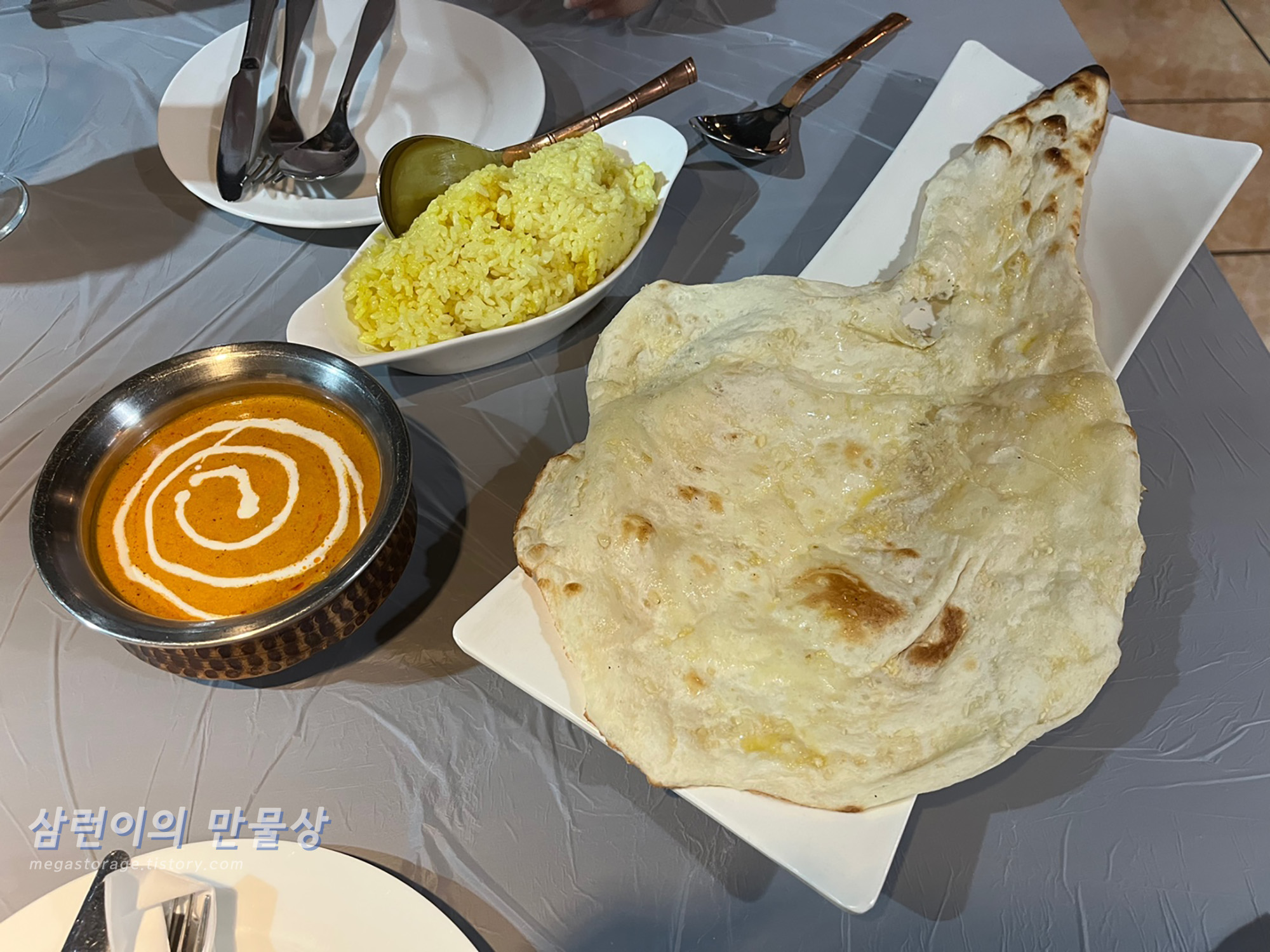 갈릭난, 강황밥, 치킨 마카니 입니다.