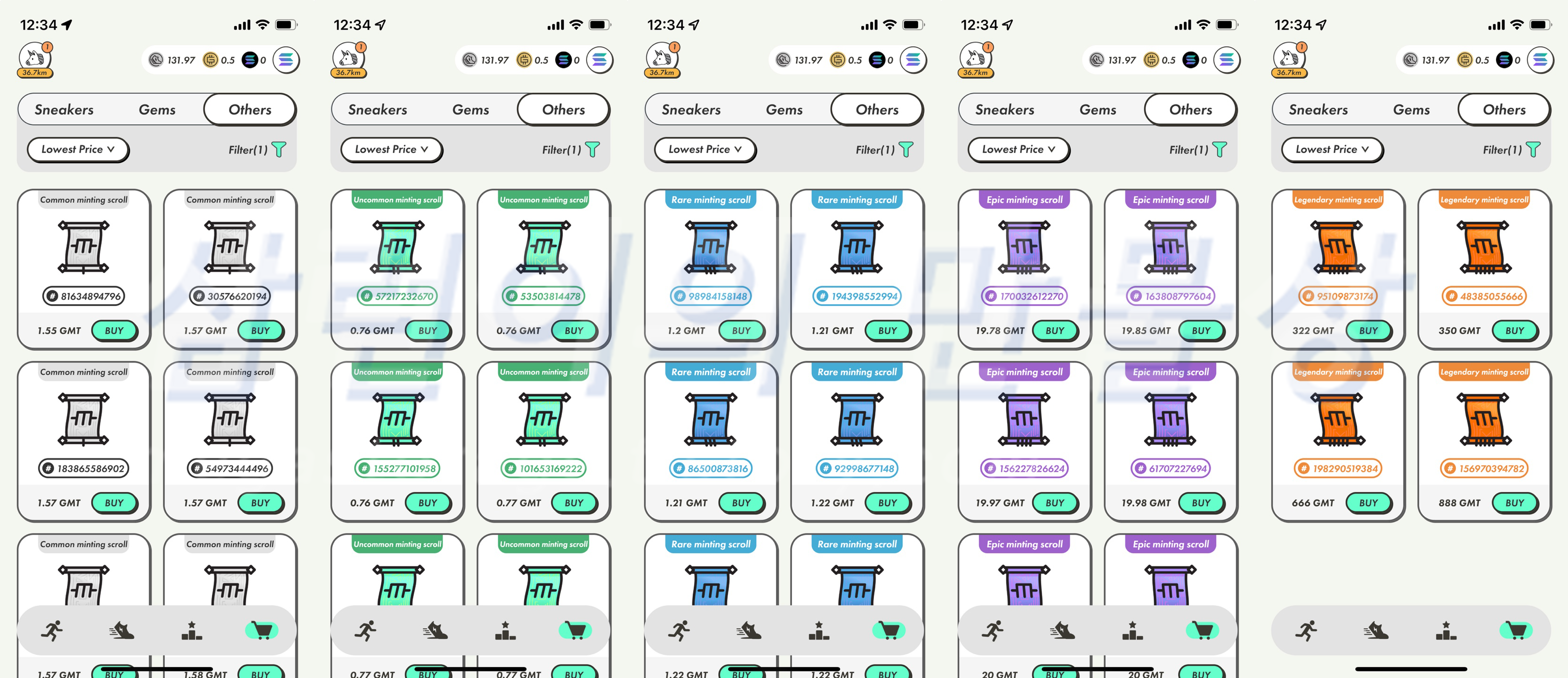 민팅 스크롤은 스태픈 내의 샵에서 구매할 수 있습니다. 상단의 'Others' 탭을 선택한 후 'Filter'에서 원하는 등급을 선택하면, 해당 등급의 민팅 스크롤을 최저가로 볼 수 있습니다.