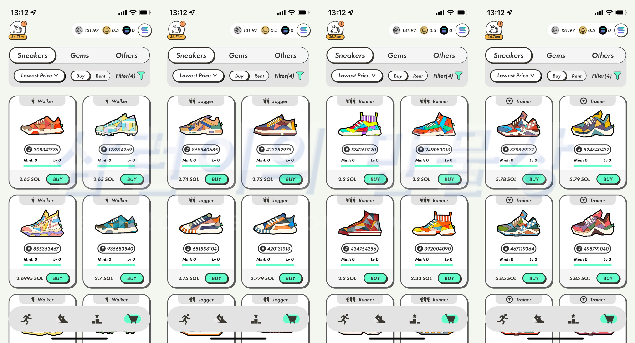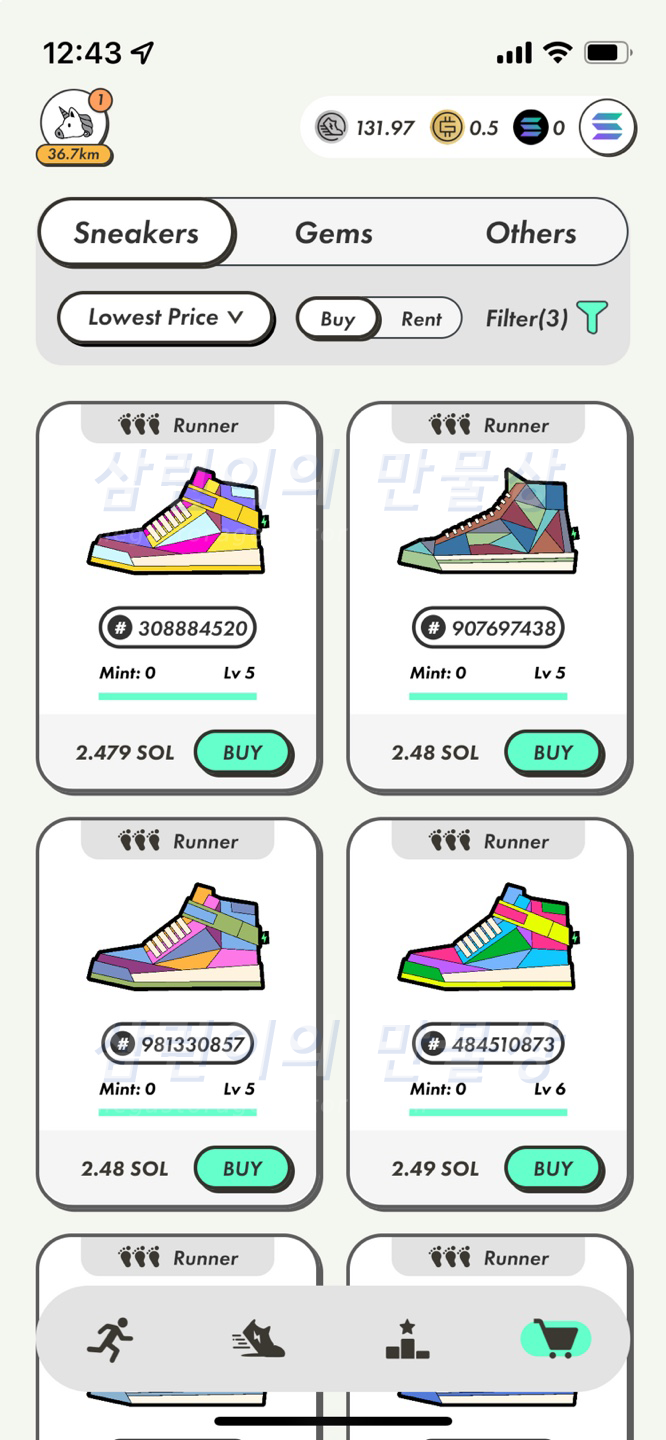 민팅을 하기 위해서는 신발을 사야 합니다. 가장 최저가로 진행을 해 볼 것이므로, 커먼 등급의 레벨 5 러너 신발의 가격을 확인해봅시다. 아, 민트 카운트는 모두 0으로 찾아봤습니다.