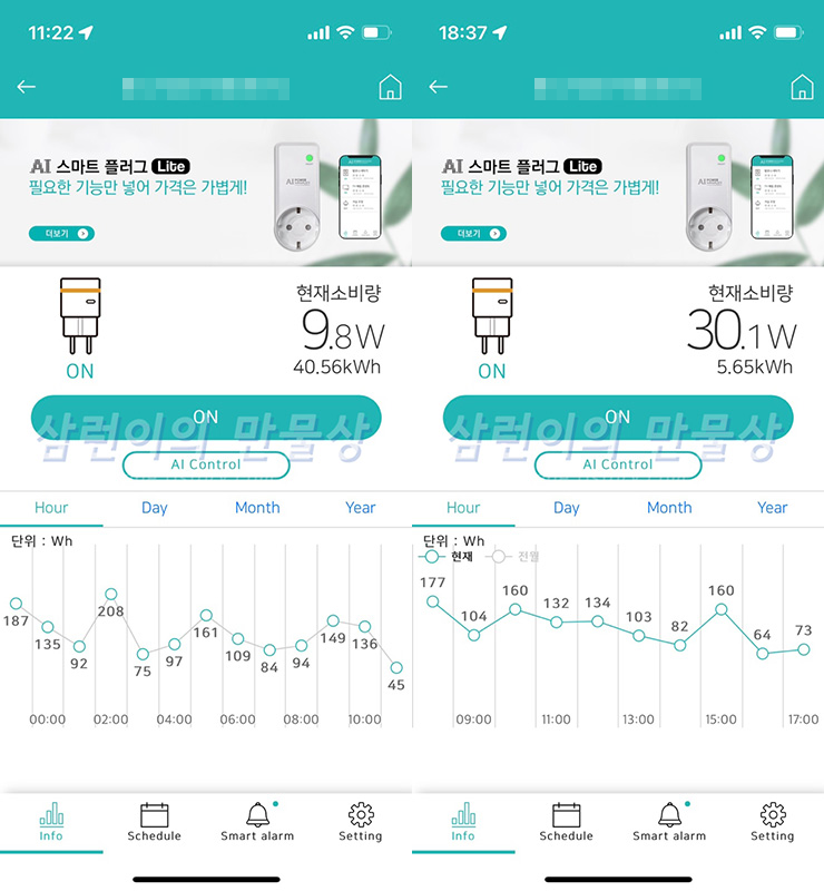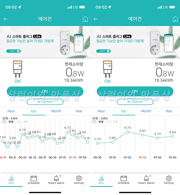 평일 저녁 퇴근하기 전에 앱으로 에어컨을 미리 켜둡니다. 실내가 매우 덥기 때문에 초반에는 에어컨의 소모 전력이 꽤 높습니다. 실내를 차갑게 하는 것이 1순위니까요. 밤 8시와 9시에 많은 에너지를 쓰다가 밤 10시 이후부터 소비전력이 서서히 줄어드는 것을 볼 수 있습니다. 집안 전체가 시원해졌기 때문입니다.