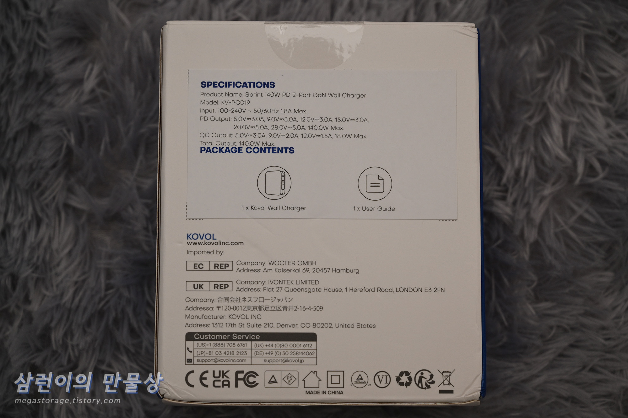 KOVOL KV-PC019 충전기의 박스 외관은 꽤 깔끔합니다. 후면에는 충전기의 스펙과 전세계에 있는 지점의 주소가 기재되어 있습니다. 독일 함부루크(Hamburg), 영국 런던(London), 일본 도쿄(동경) 및 미국 덴버(Denver)에 각 지점이 있네요.