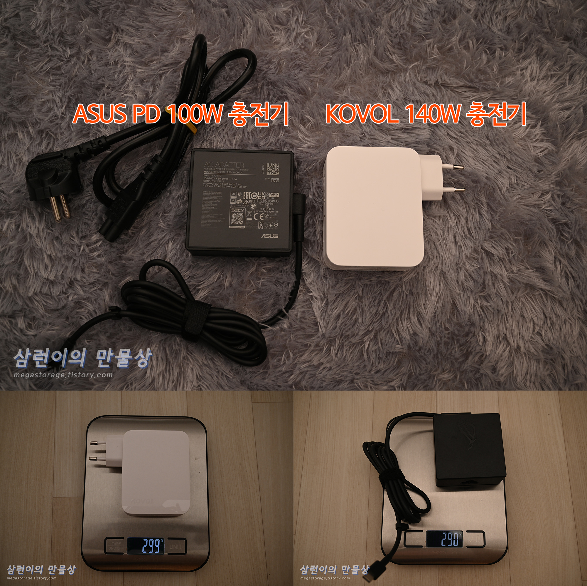 두번째로 ASUS의 100W 노트북 충전기입니다. 무게가 비슷합니다. USB-C 케이블의 차이가 있지만, 전원 케이블을 합하면 훨씬 무거울 것입니다. 이렇게 노트북 충전기도 대체 가능합니다.
