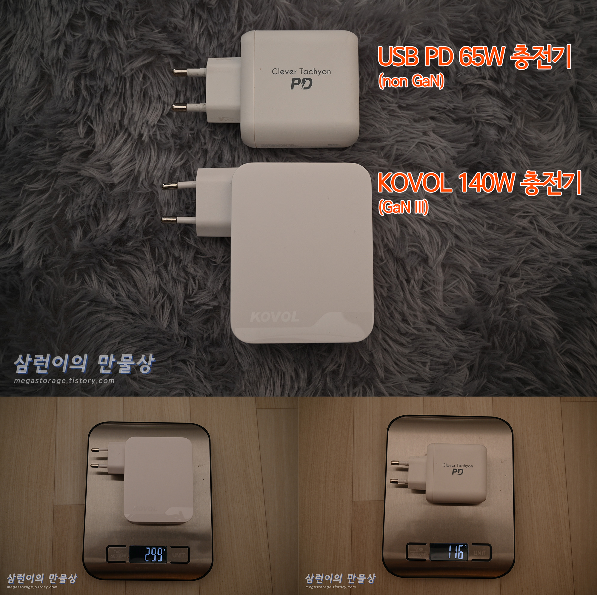 첫번째로 꽤 오래전에 구입한 USB PD 충전기인 '클레버 타키온'의 65W 충전기입니다. 무게는 2배 이상 차이가 나지만, 크기가 비슷하면서 출력 성능이 2배 차이입니다.