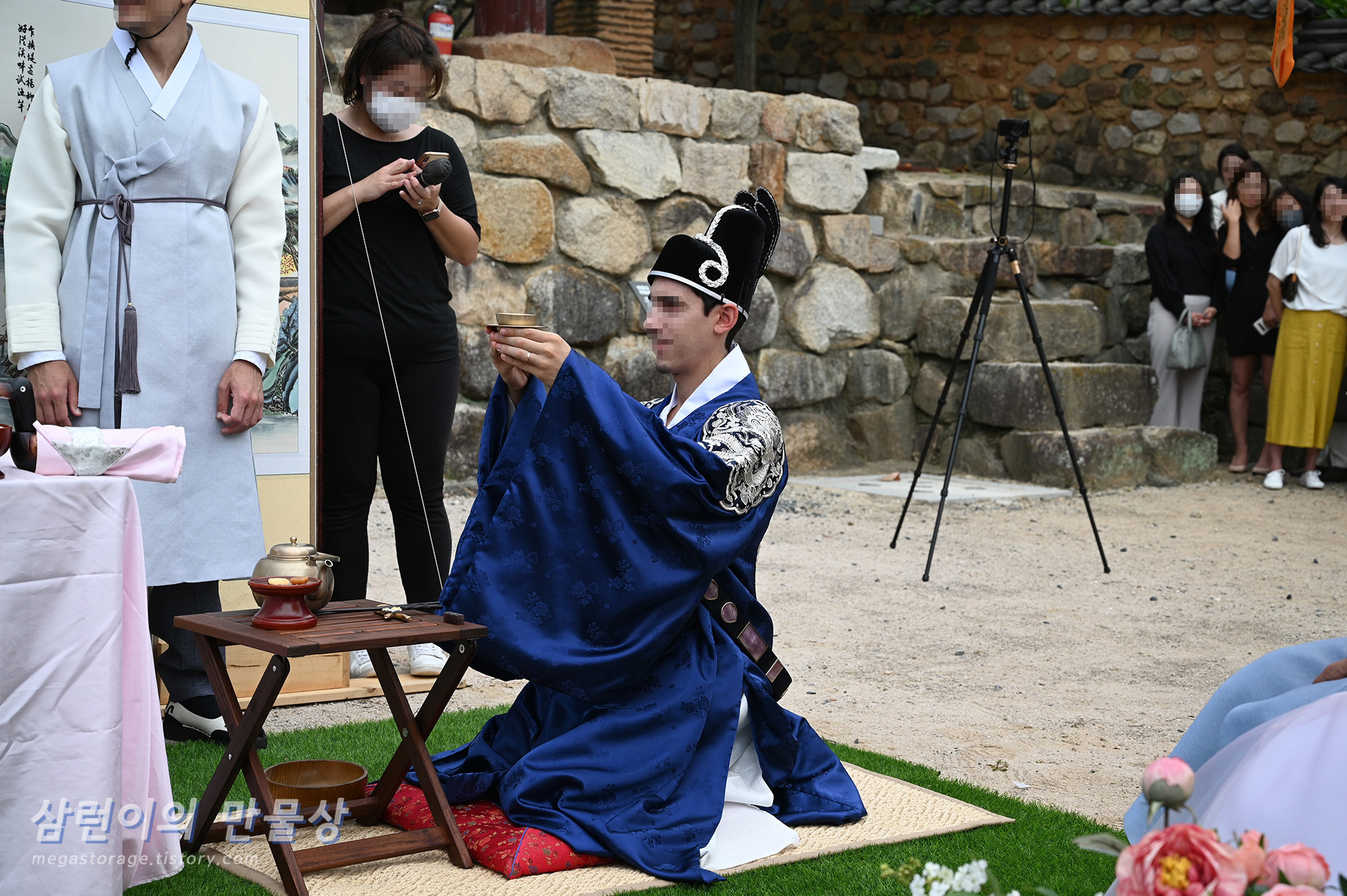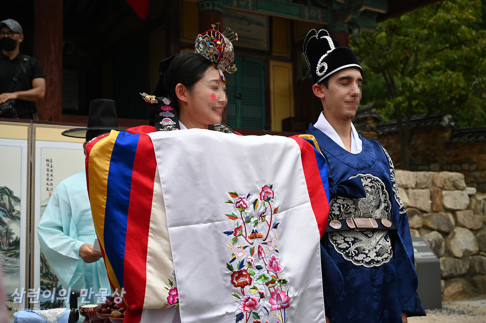 신랑은 양손을 사용할 수 있는데, 신부는 혼례복 때문에 손을 사용할 수 없습니다. 그래서 양 옆에 계신 분들이 모든 절차를 도와주십니다.
