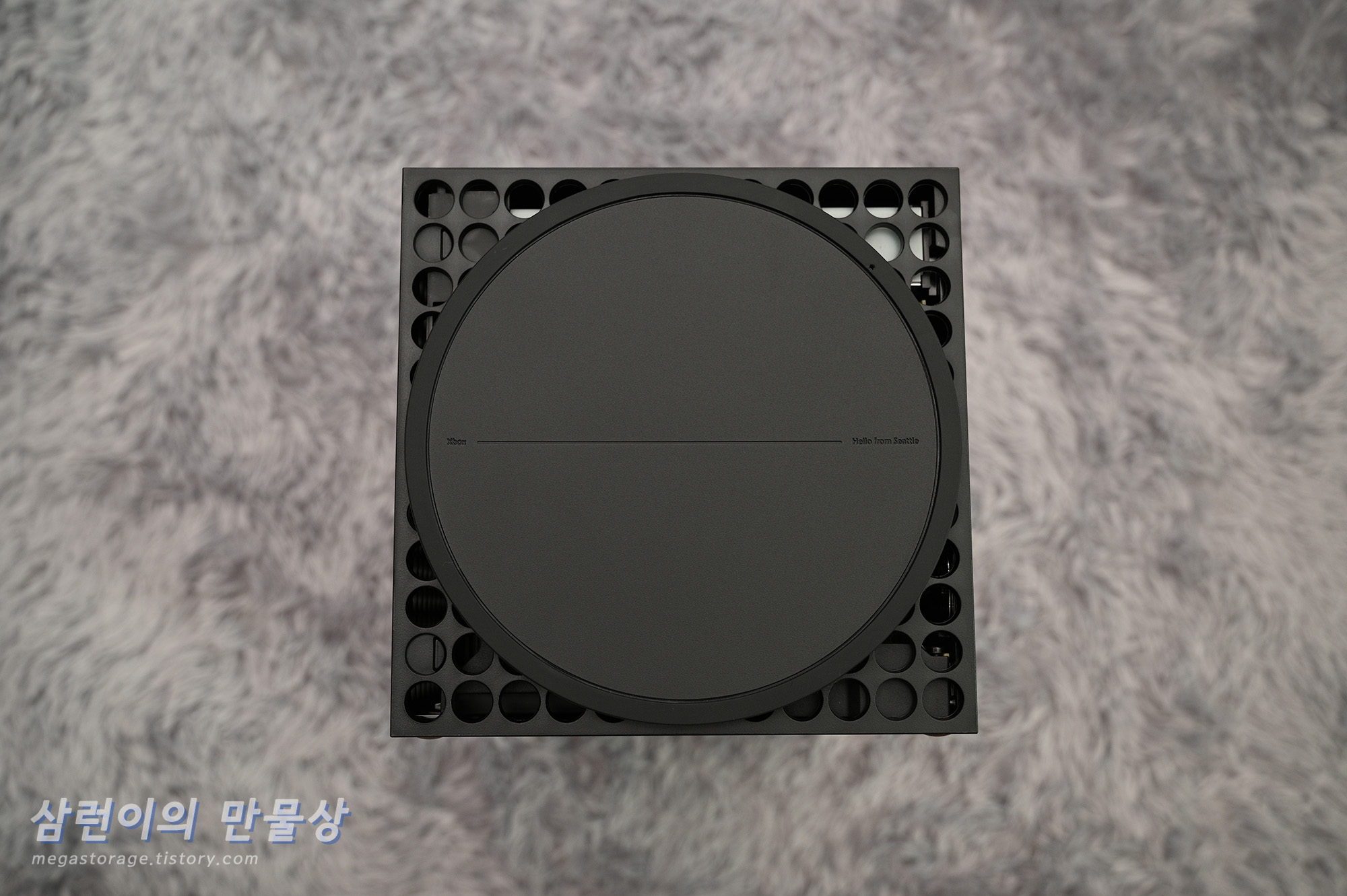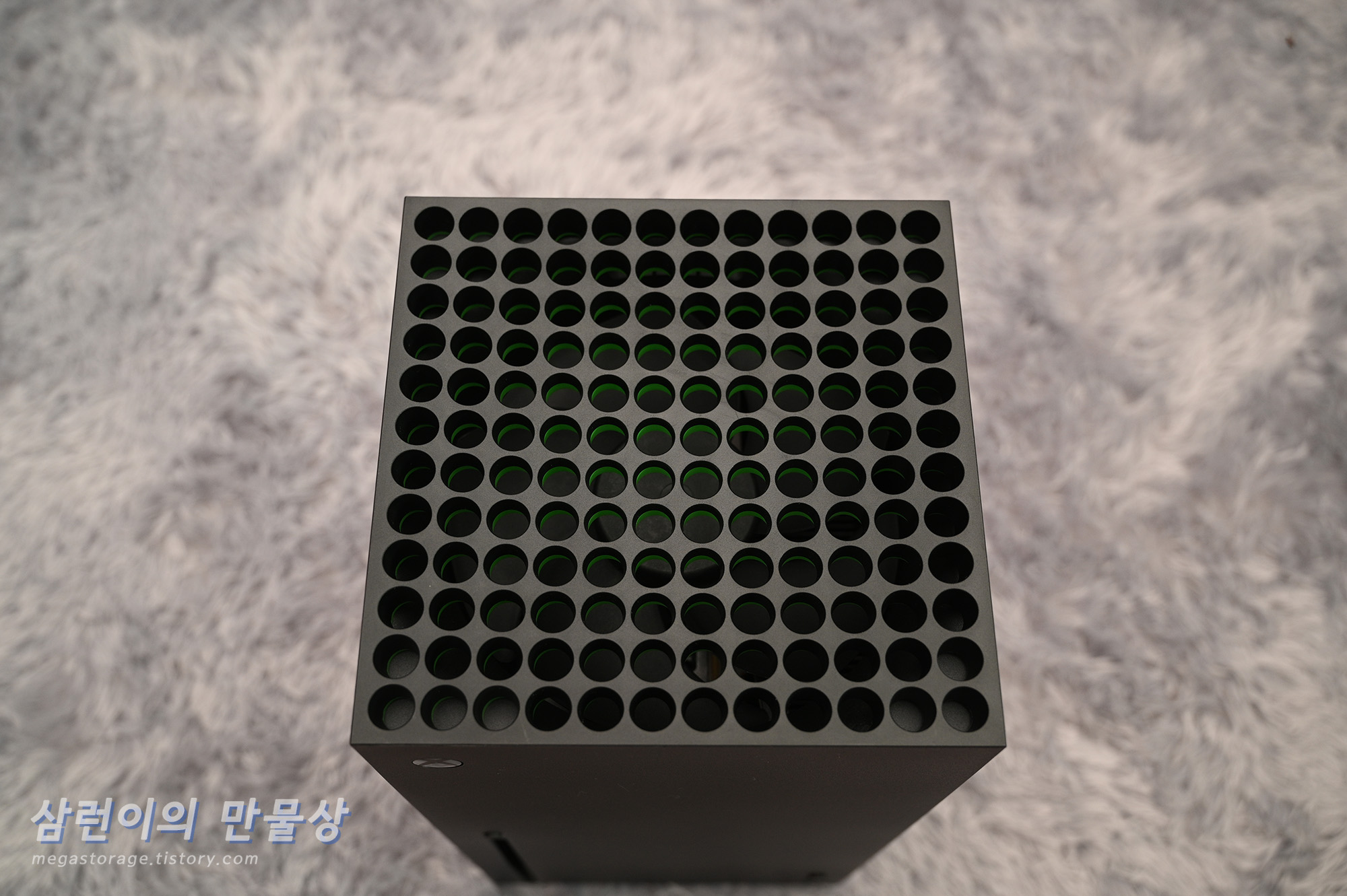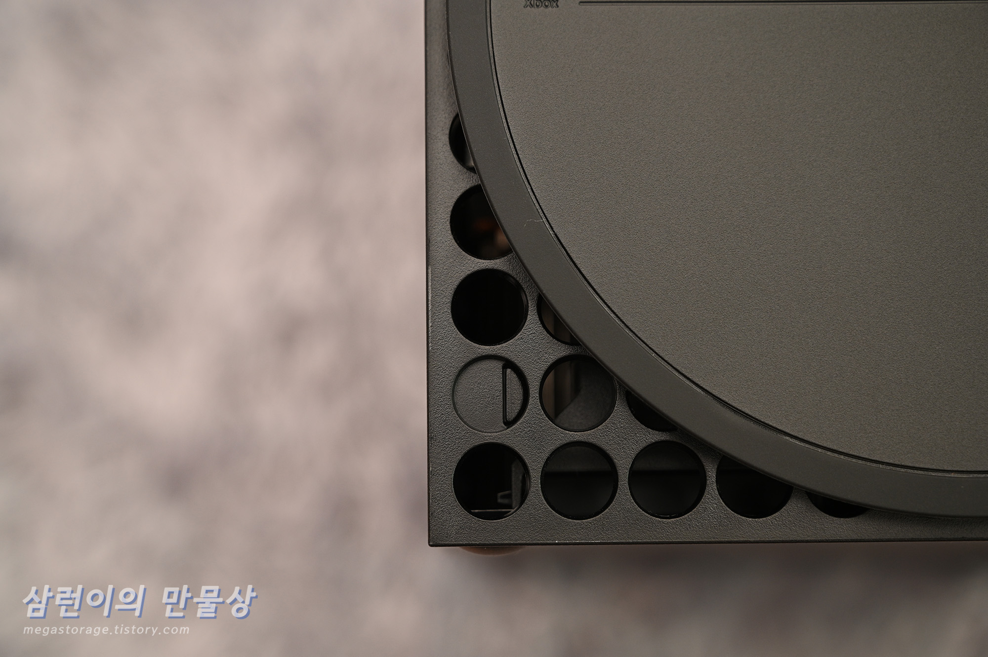엑시엑 본체 상단은 구멍이 많이 뚫려있습니다. 팬이 뜨거운 바람을 위로 밀어내는 방식입니다.