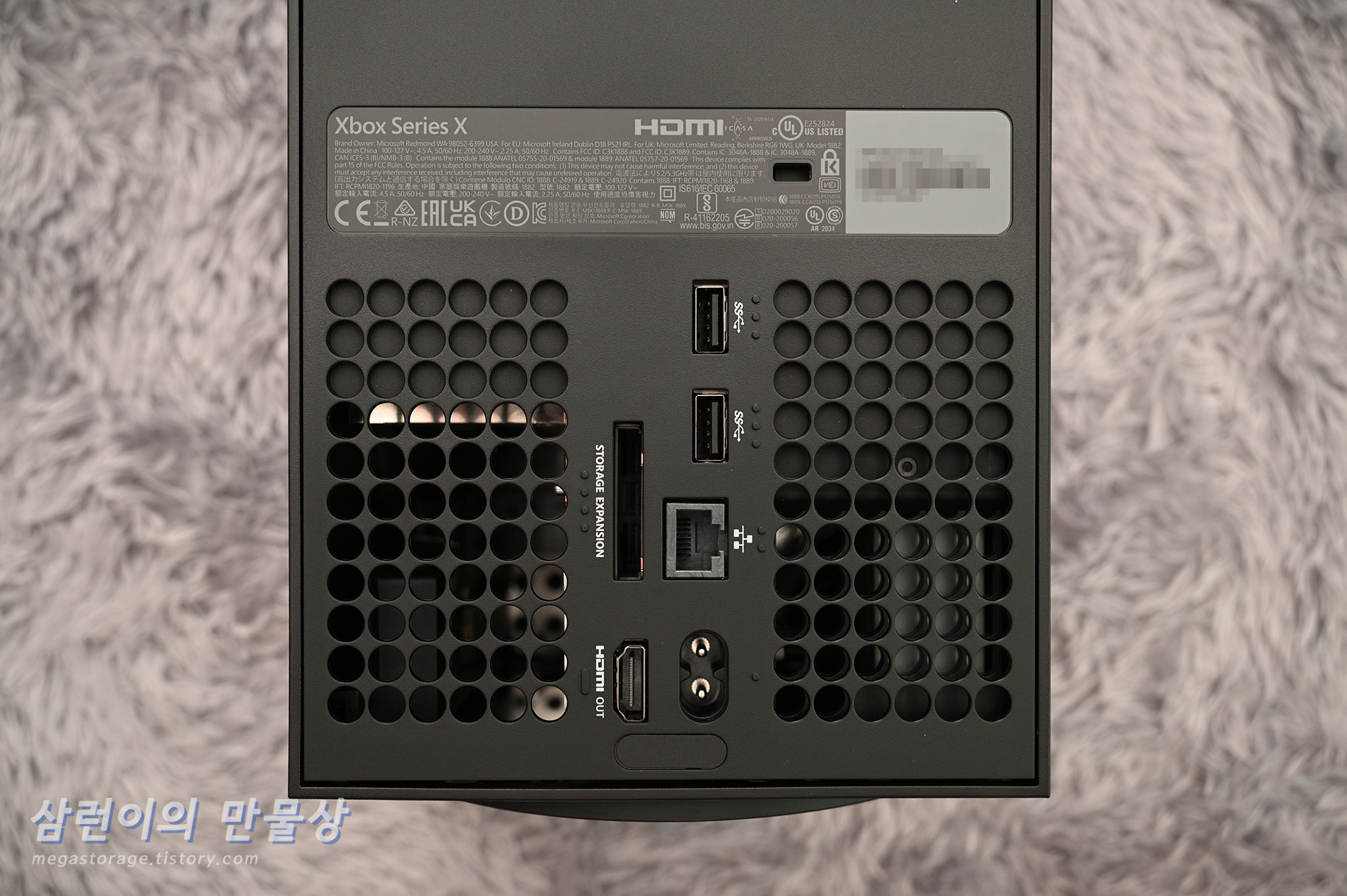 후면에는 여러가지 포트가 있습니다. 확장 스토리지 슬롯(좌측), HDMI 포트(좌측 하단), USB 포트(우측 상단), 랜 포트(우측) 및 전원 포트(우측 하단)가 있습니다.