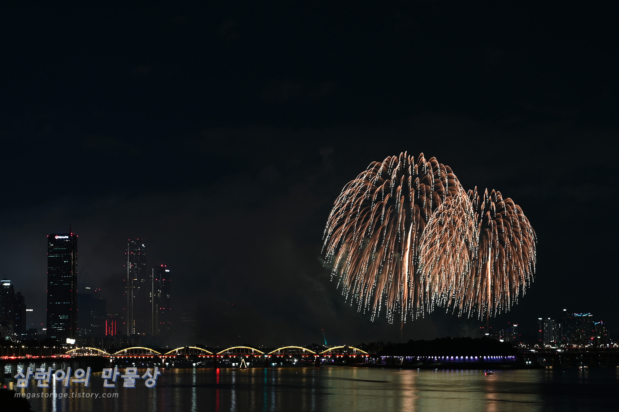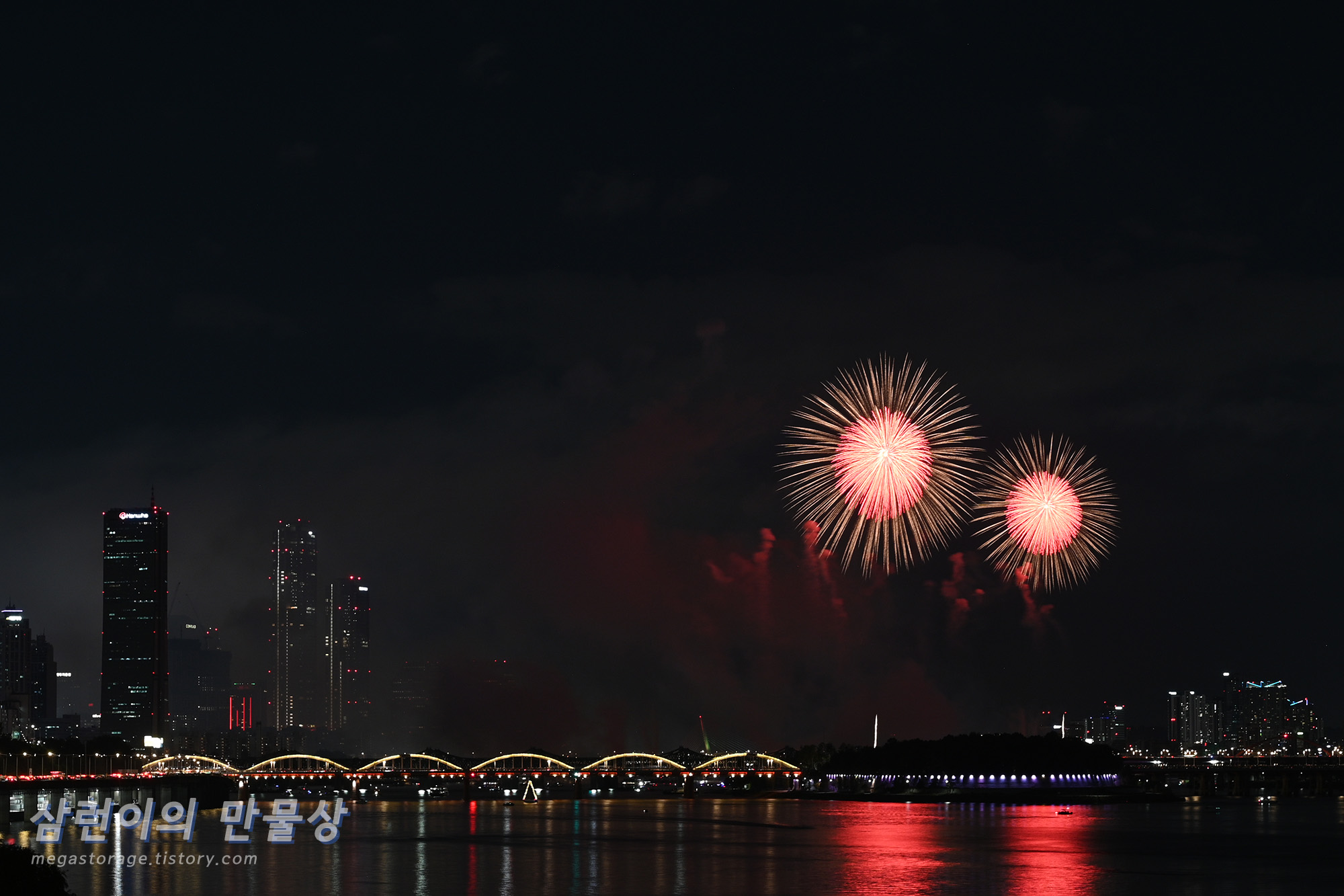 불꽃놀이는 하늘 높은 곳으로 쏘기 때문에, 불꽃을 쏘는 지점 주변의 탁 트인 공간이라면 편하게 볼 수 있습니다. 불꽃은 보통 원효대교와 한강대교 사이에 떠 있는 배에서 쏩니다.