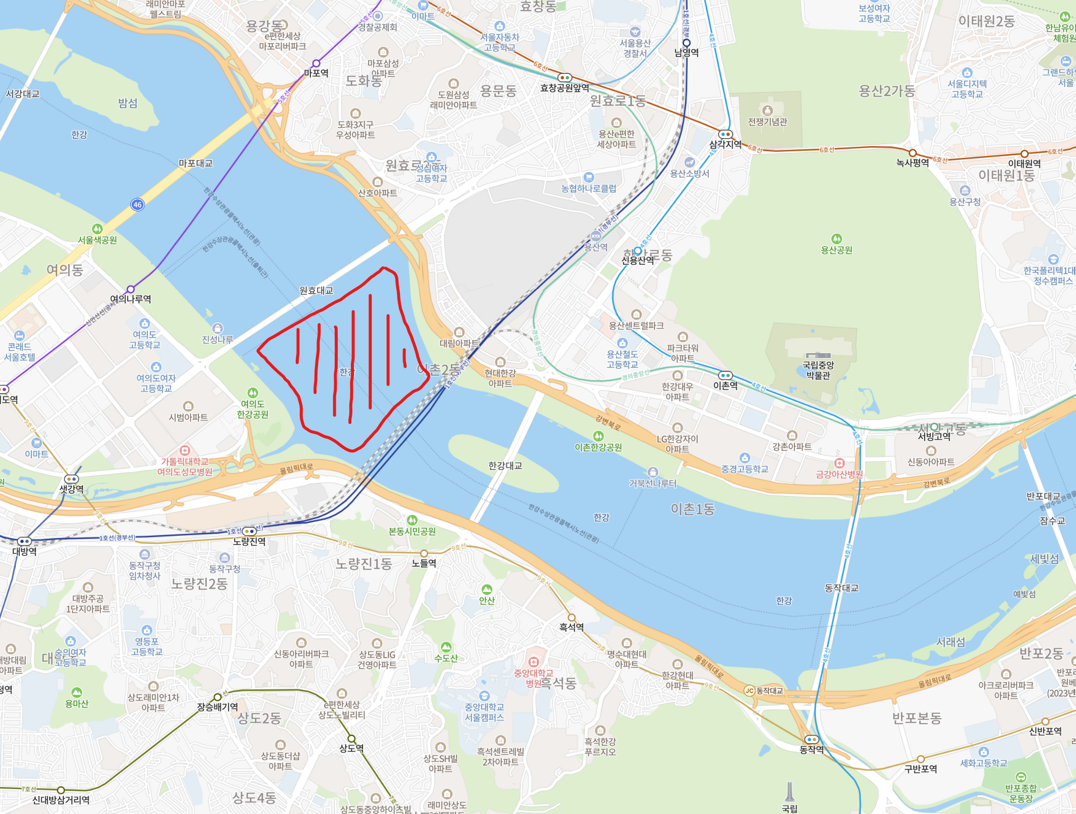 그래서 원효대교, 여의도 한강공원, 이촌 한강공원, 한강대교 및 그 주변의 장소에서도 편하게 볼 수 있습니다. 저는 다양한 변수를 고려하여 약간 멀리에 있는 '동작대교'로 갔습니다. 사람이 어마무시하게 많을 것이며 집에 가는 시간도 고려를 해야 하기 때문입니다. 동작대교 근처에 있는 동작역에서 2호선을 타고 가면 되거든요.