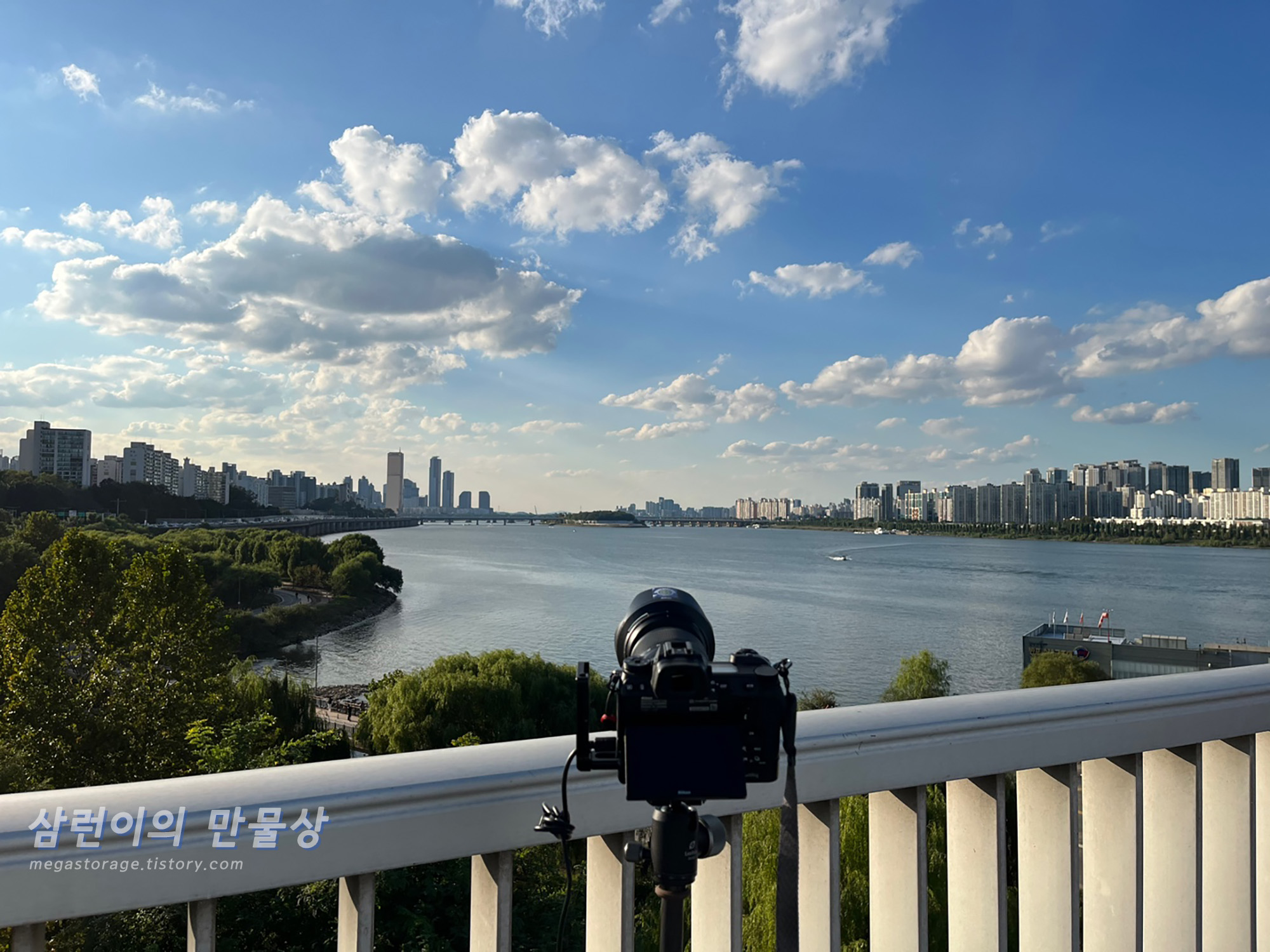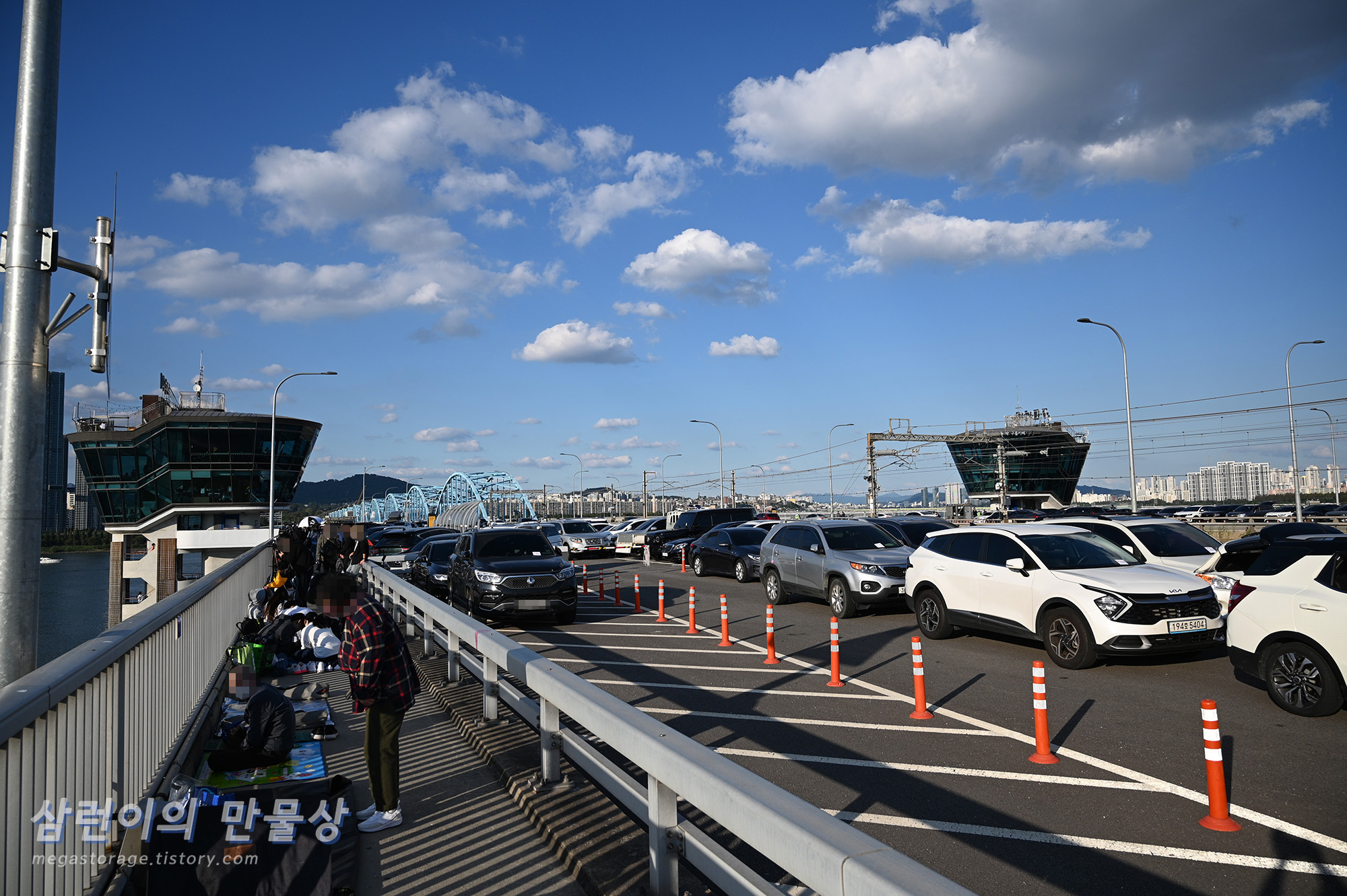 다리 중앙은 이미 선점 끝났고... 사람들이 계속 들어오게 되면서 여기까지 사람들이 많았던 것입니다. 이렇게 먼 곳인데도 이 시간에 사람이 많을 줄은 상상도 못했습니다. 이촌으로 넘어가는 계획은 포기하고, 여기에 가방을 내려놓고 카메라를 설치했습니다.