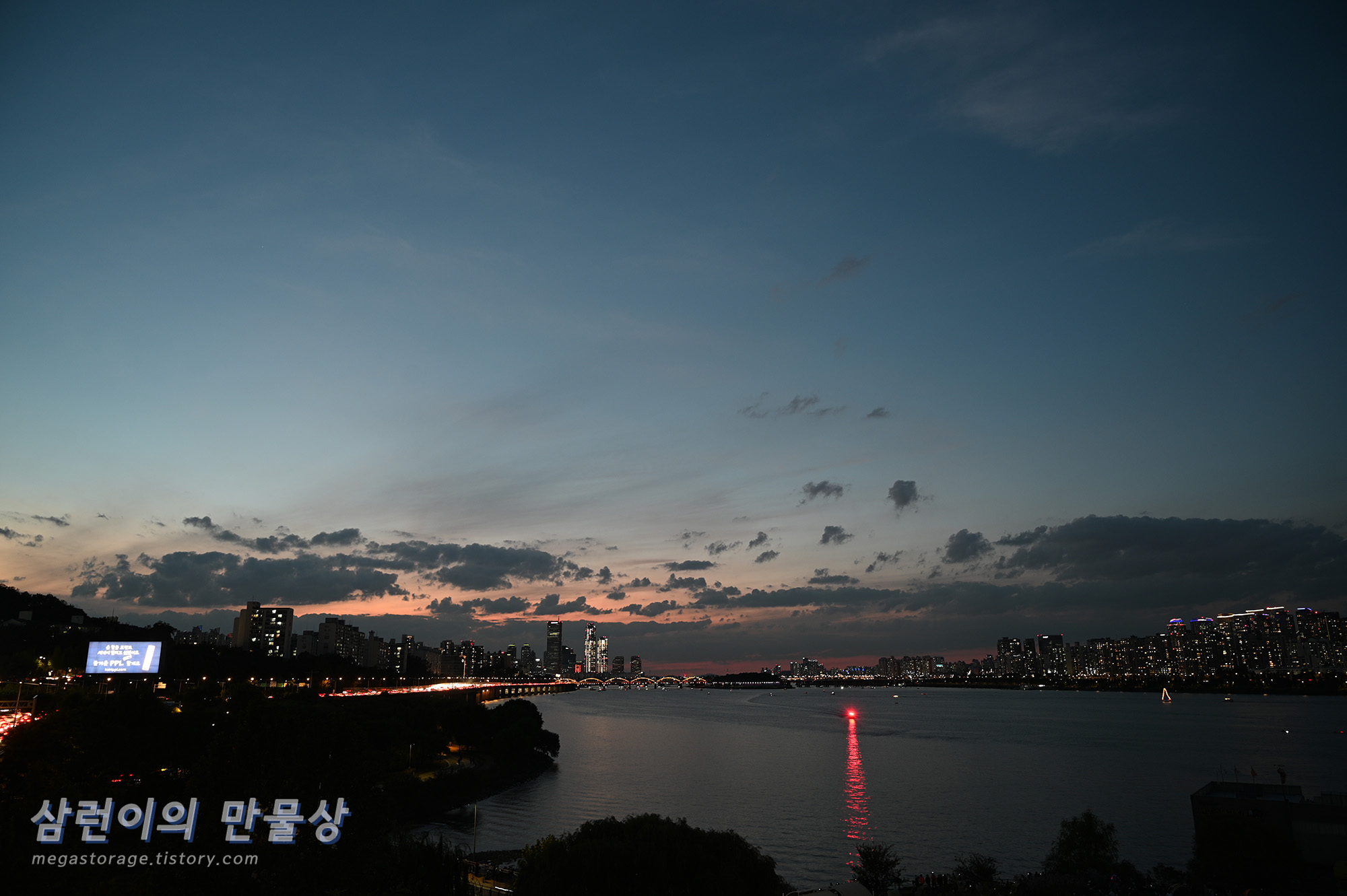 카메라 설치 후 앉아서 마냥 기다렸습니다. 저녁 7시 20분 부터 불꽃 놀이가 시작되거든요. 편의점에서 사온 김밥을 먹으면서 유투브를 보다보니 벌써 해가 지기 시작했습니다.