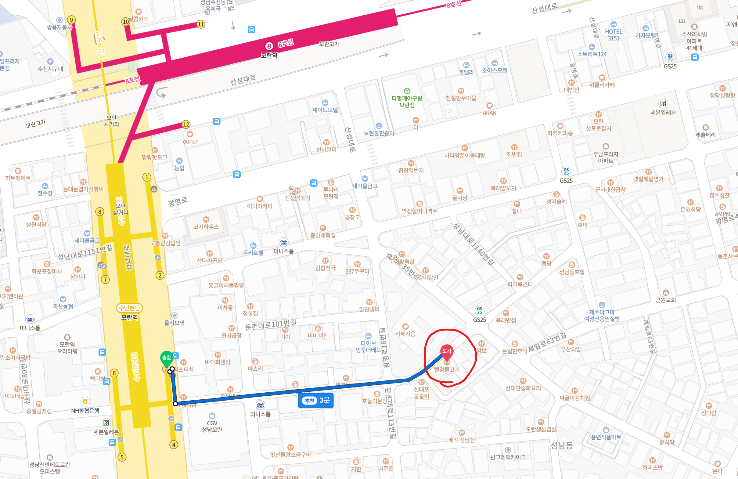 모란역 3번 출구에서 나온 후 5분 정도 걸어오면 빨강물고기가 있습니다.