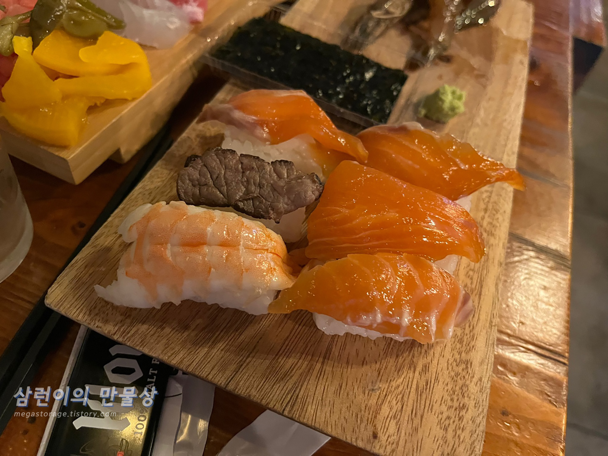 숙성회를 시키면 초밥이 같이 나옵니다. 연어초밥 4개, 소고기초밥 1개, 새우초밥 1개입니다. 와사비가 들어있지 않아서 직접 올려야합니다. 와사비를 못 드시는 분들을 위한 엄청난 배려입니다.