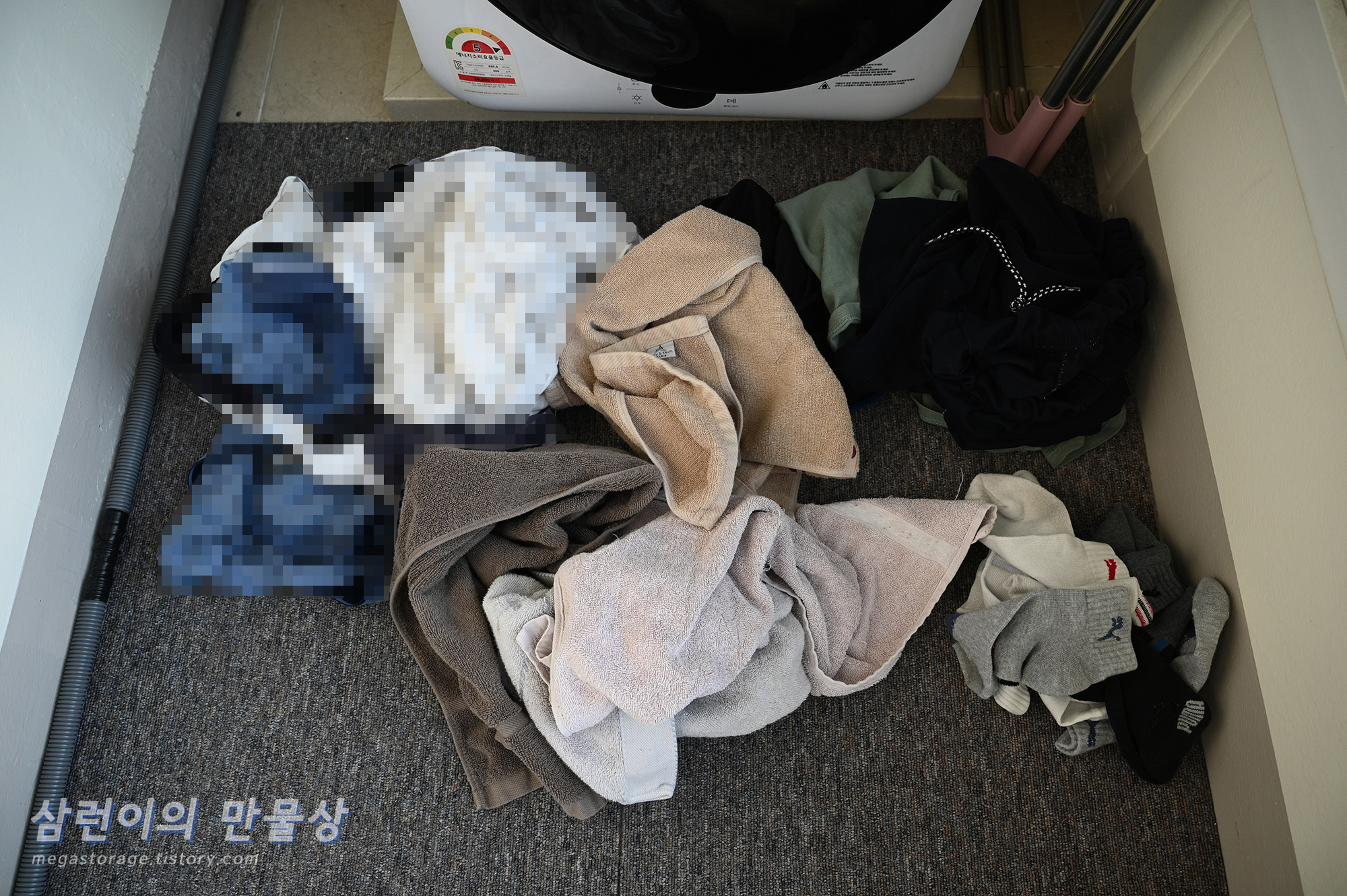 빨랫감들이 얼마 되지도 않는데 먼지가 어마어마하게 모여있는 것을 볼 수 있습니다. 머리카락들도 많이 모여있네요.