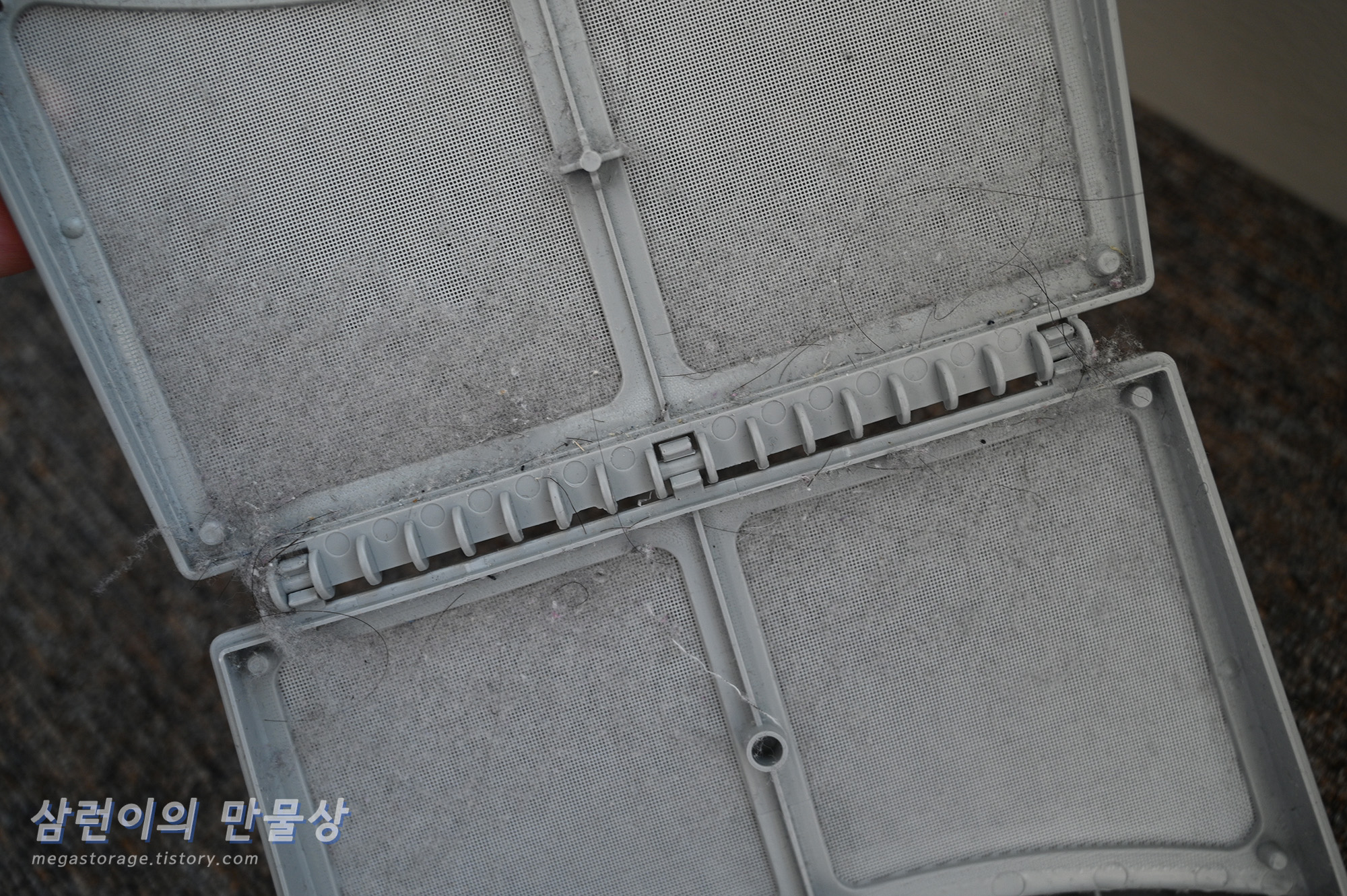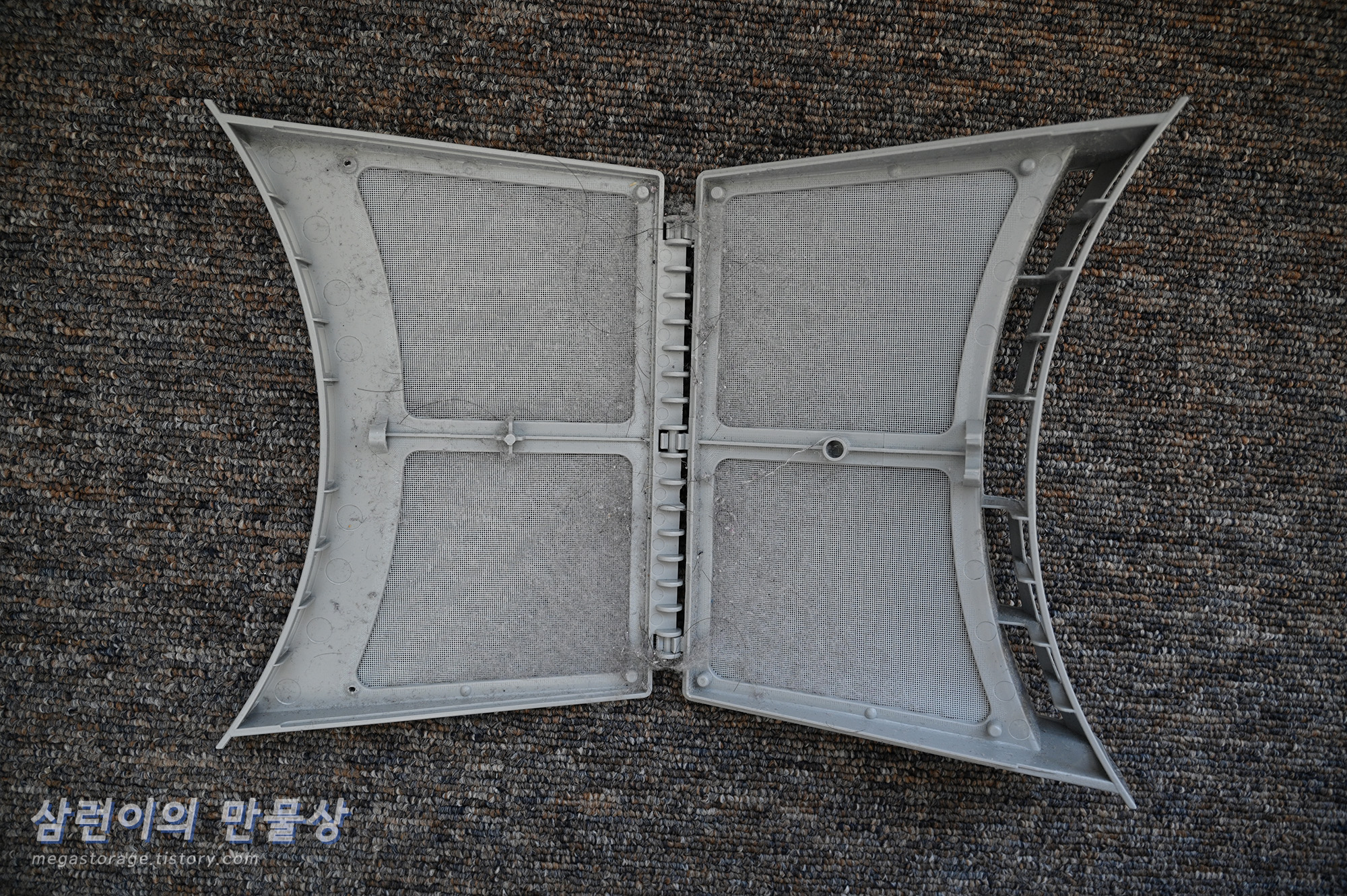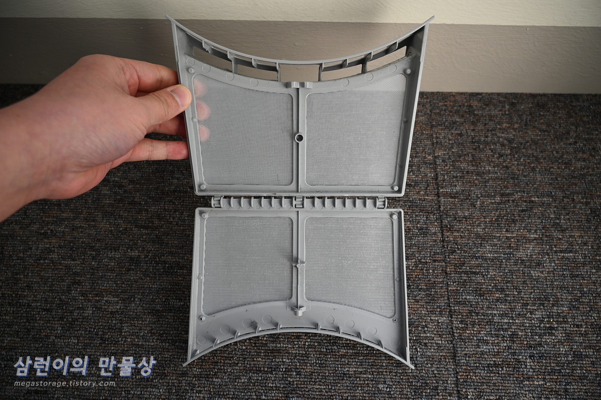 먼지 필터는 이렇게 생겼으며, 두 손으로 잡아 당기면 안쪽의 먼지를 제거할 수 있는 구조로 되어 있습니다.