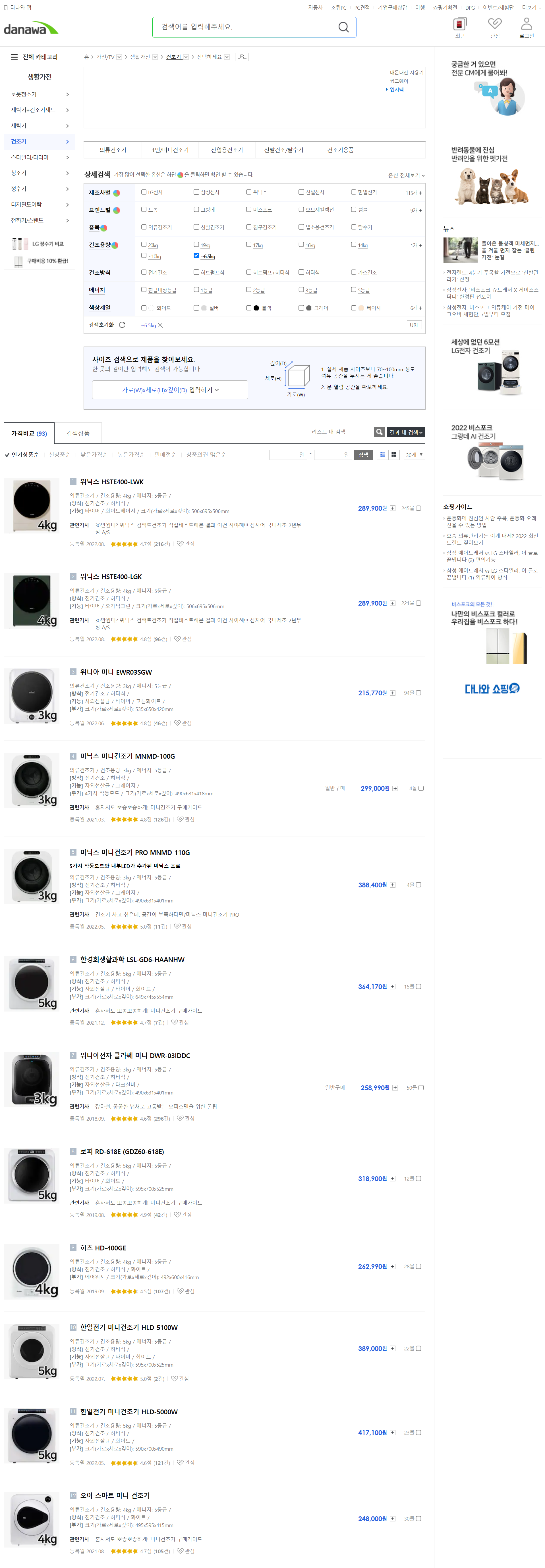 이렇게 된 이상, 세탁기 근처에 배치할 수 있는 미니 건조기를 한 번 알아보려고 찾아봤습니다. 일반 건조기와 미니 건조기는 건조용량이 6.5kg를 기준으로, 일반 건조기는 8kg 이상, 미니 건조기는 4kg 이하에 많이 분포해있었습니다. 방금 설명했듯이, 위치와 크기 때문에 미니 건조기를 알아봤습니다.