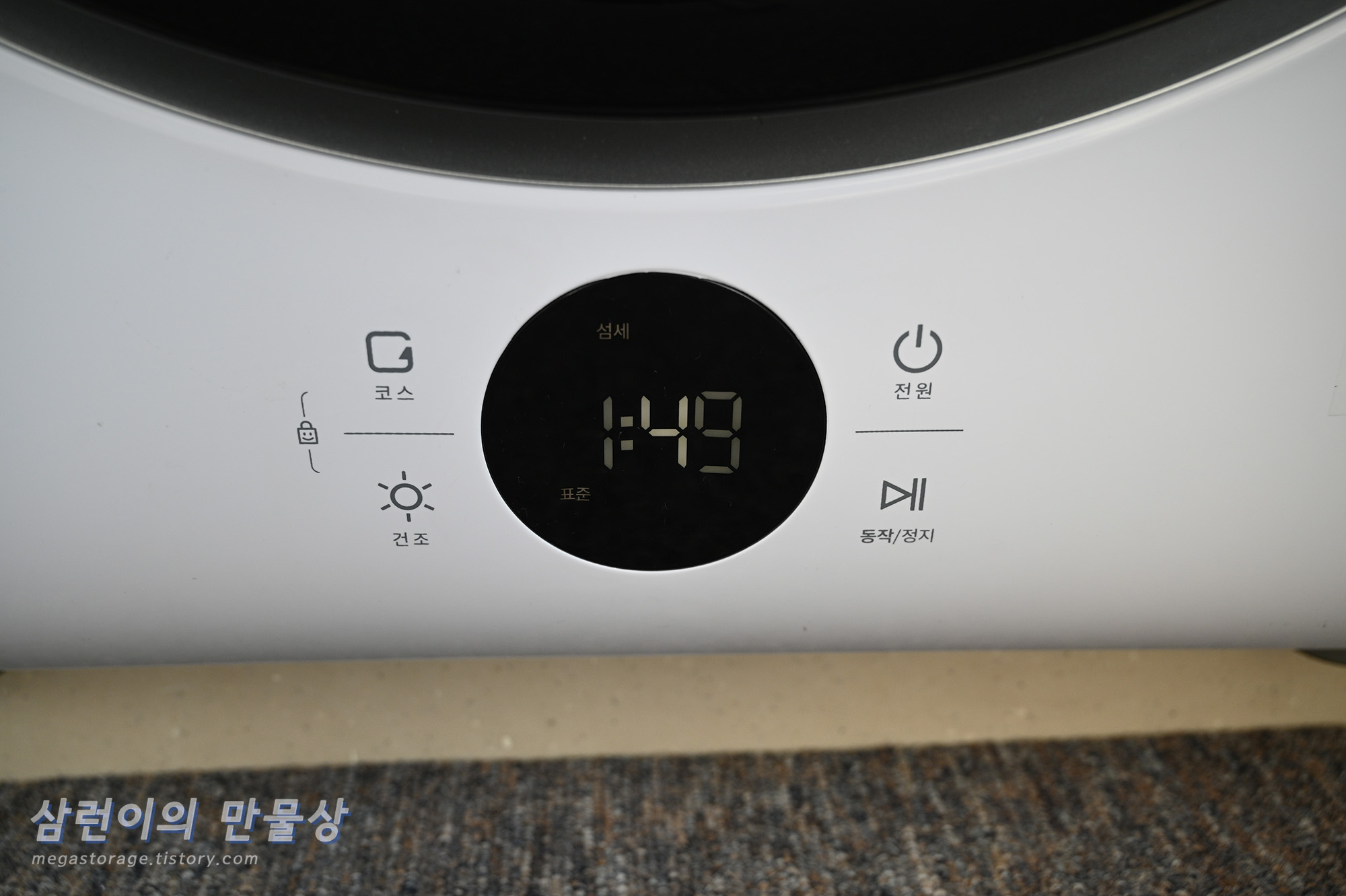 건조기가 가동된지 약 5분이 지나면 스스로 시간을 다시 계산합니다. 1시간 49분이라고 나옵니다. 만약 짧게 건조를 해야 한다면 1시간짜리와 30분짜리 코스가 있으니, 해당 코스를 선택하시면 됩니다.