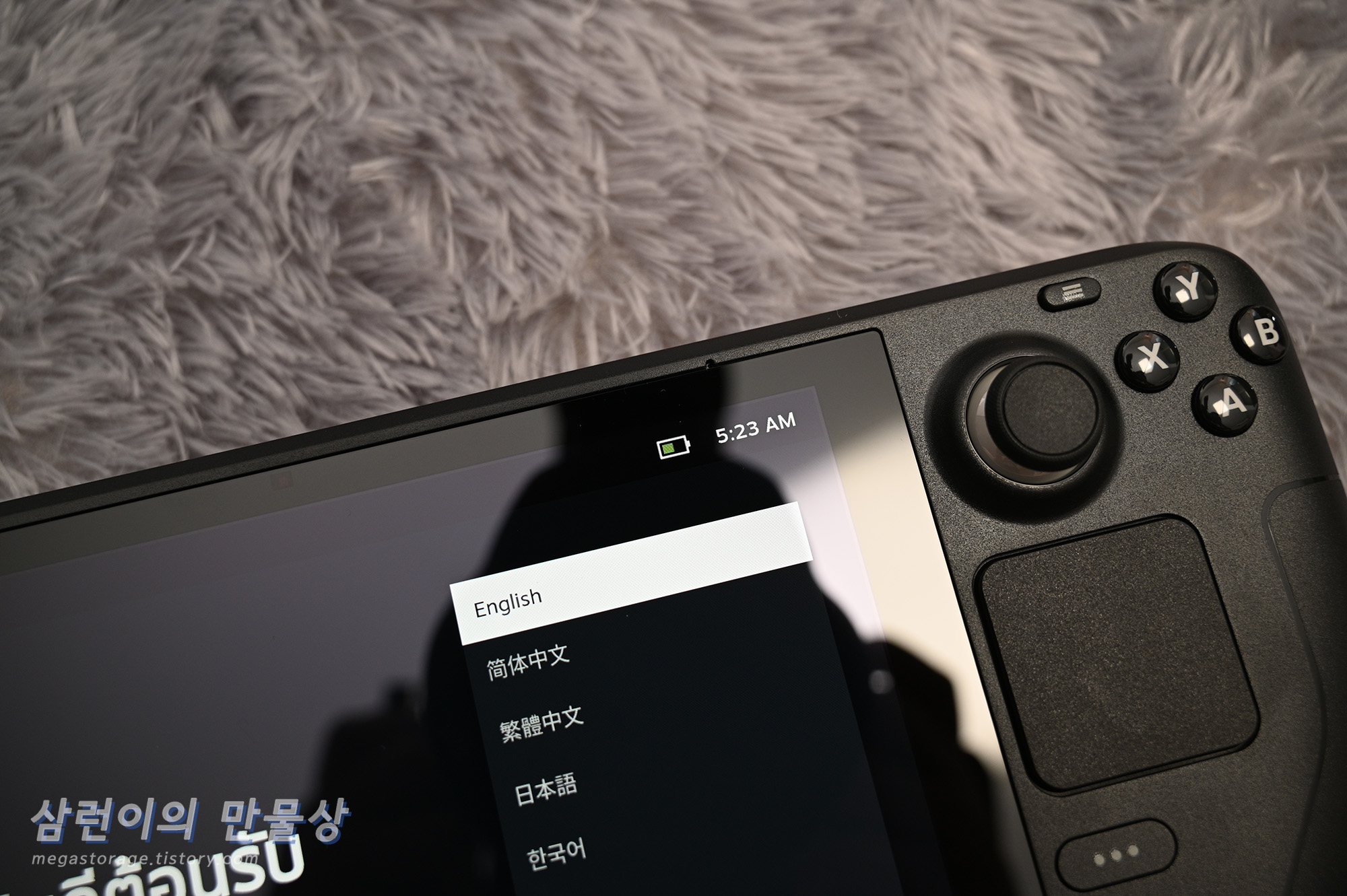 배터리는 50%쯤 충전되어 있는 상태로 보입니다. 한국어 선택, 와이파이 연결 및 스팀 로그인해서 초기 설정을 끝냈습니다.