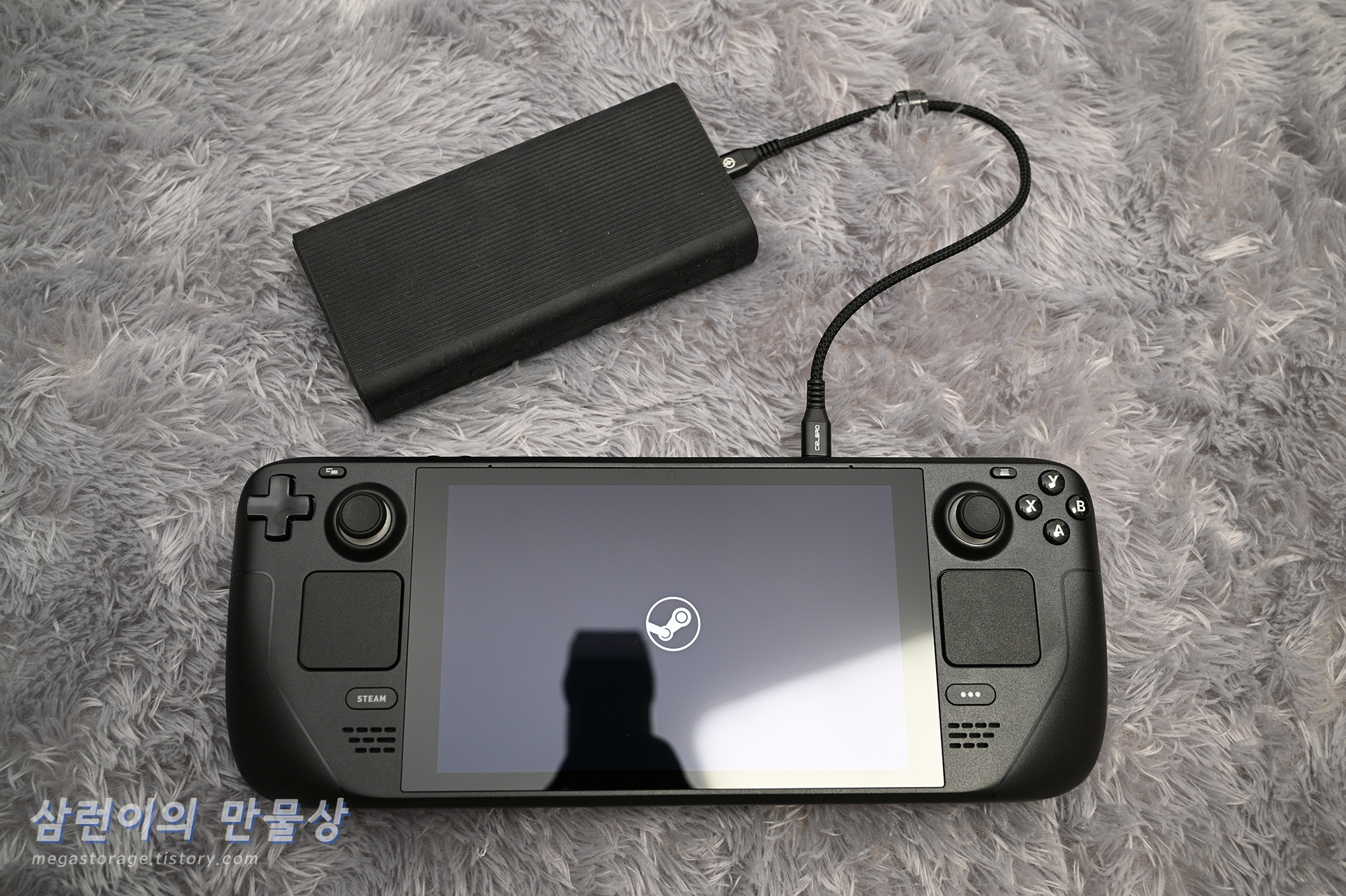 스팀덱은 배터리 보호모드에 들어가있는 상태라서 충전기나 보조배터리를 연결해야지 전원이 켜집니다.