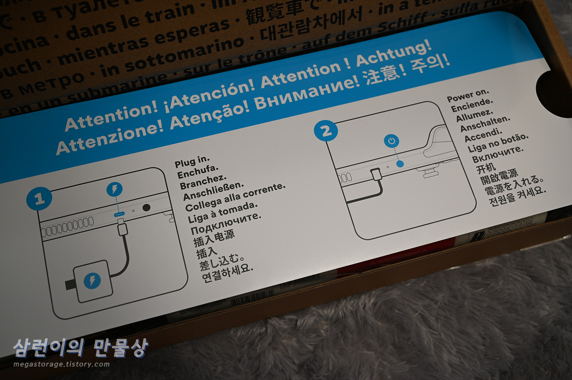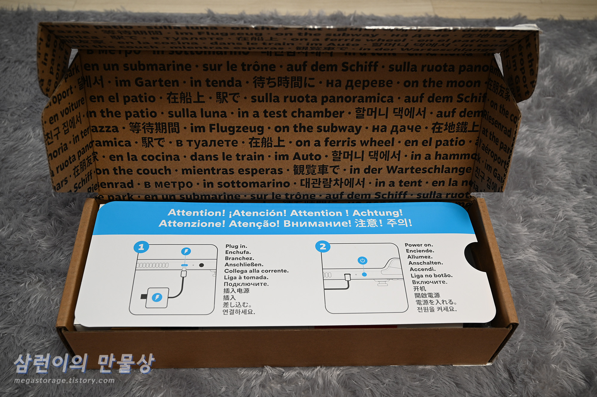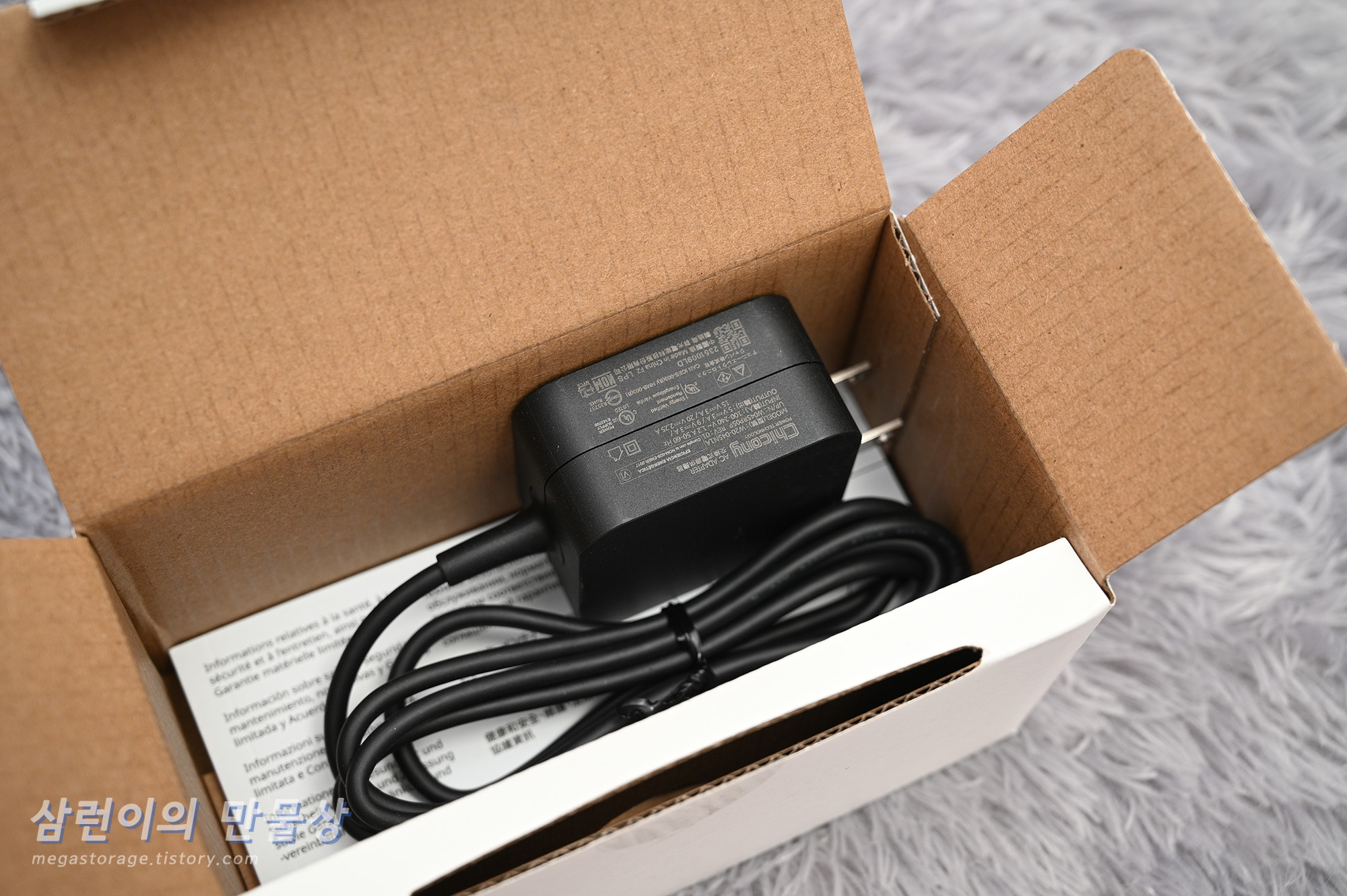 전원 아답터는 USB-C 포트 형태의 1구 형태입니다. 직구 제품이라서 110V 모양입니다. (돼지코 필요)