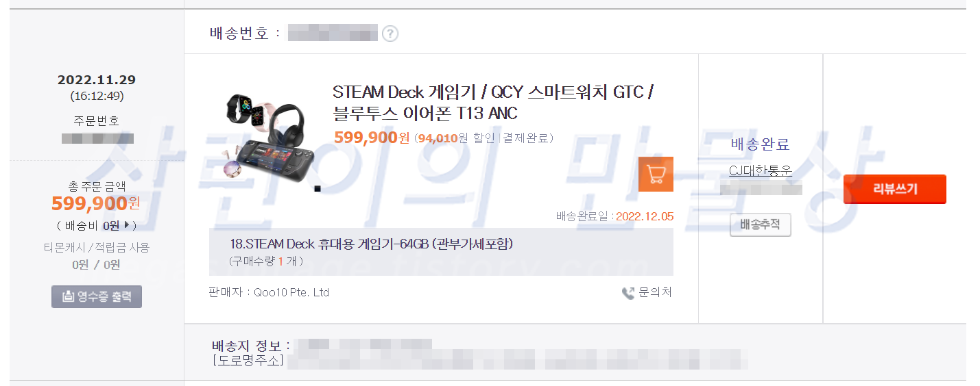 2022년 11월 29일에 티몬에서 스팀덱 64기가 모델을 59만 9천원에 결제했습니다. 그리고 1주일이 지나지도 않은 6일 뒤에 집에 도착했습니다. 상당히 빠르게 온 것이죠.