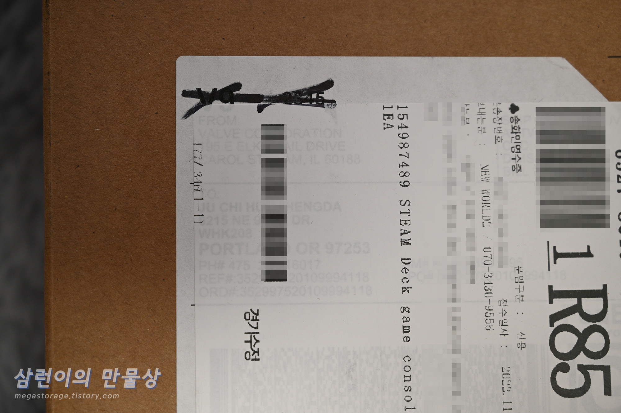 어 근데.. 운송장 스티커 밑에 있는 내용을 보니까, VALVE 본사에서 오레곤에 위치한 PORTLAND로 이동했다는 UPS? 라벨이 보였습니다. 이 스팀덱은 홍콩에서 출발했는데... 그러니까, 미국 벨브 본사에서 출하된 스팀덱이 포틀랜드의 어떤 곳으로 이동했고(배대지?), 홍콩으로 이동된 후 국내로 들어온 것이죠. 신기... 이렇게 해도 남나봅니다.