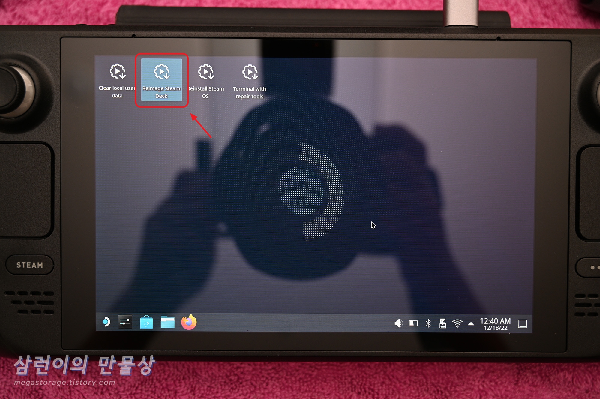 바탕화면에 아이콘 4개가 있습니다. 그 중에서 두번째의 'Reimage Steam Deck'를 선택합니다. 화면을 한 번 선택하면 실행됩니다. 더블클릭 한다고 두 번 누르면, 설치 화면이 두개 뜹니다.