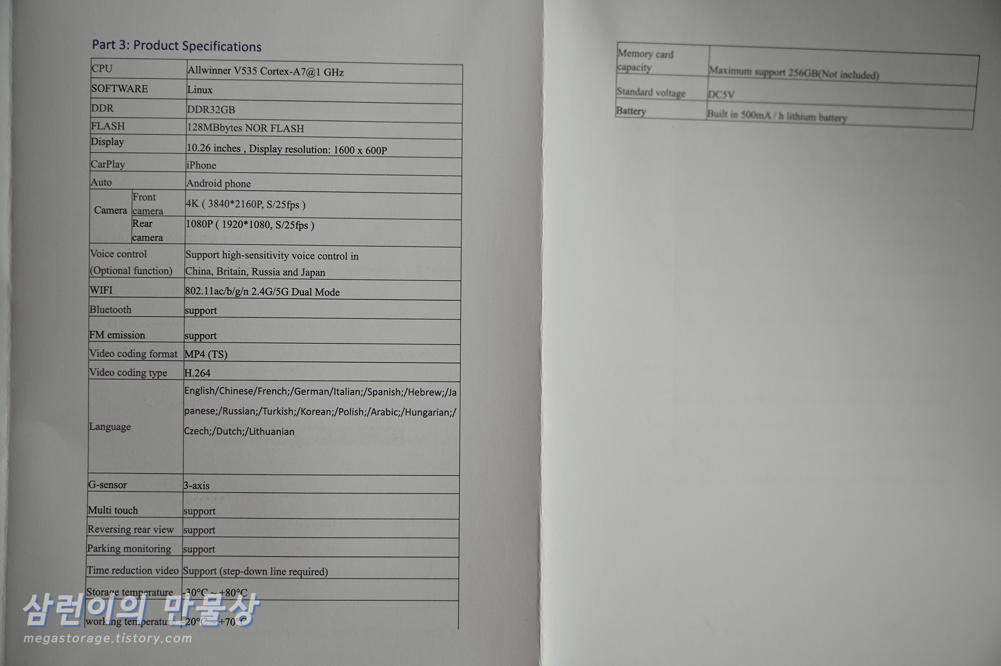 - 후방 카메라(옵션) : 1080p@25fps