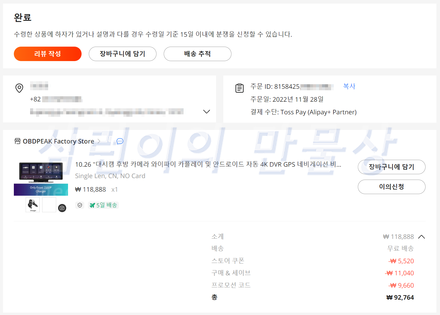 2022년 11월 28일에 알리 익스프레스에서 9만 2764원에 구입했습니다. 후방카메라와 GPS 옵션은 넣지 않았습니다.