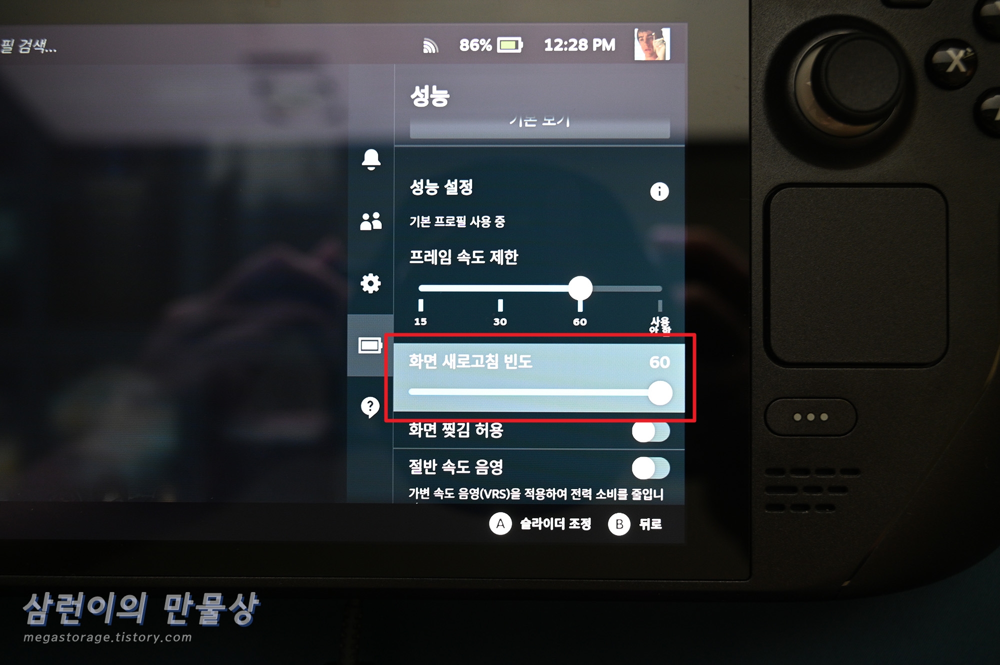 '성능 설정'의 '화면 새로고침 빈도'로 이동 후 'A' 키를 누릅니다. 그러면 '화면 새로고침 빈도'를 조절할 수 있습니다. 방향키 좌측을 눌러서 최대한 줄입니다.