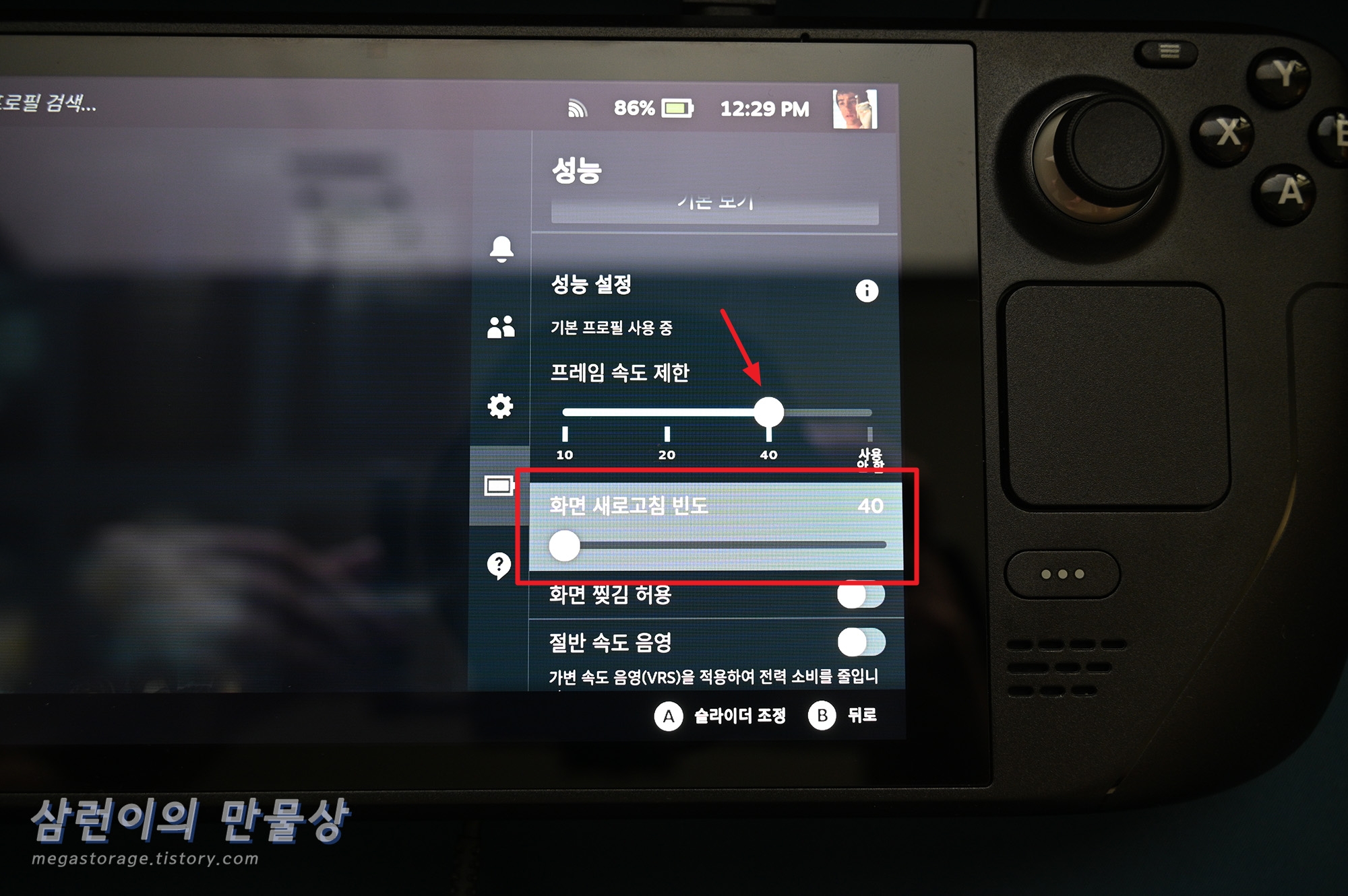 - 스팀덱이 표현할 수 있는 최대 프레임 속도를 조절합니다.