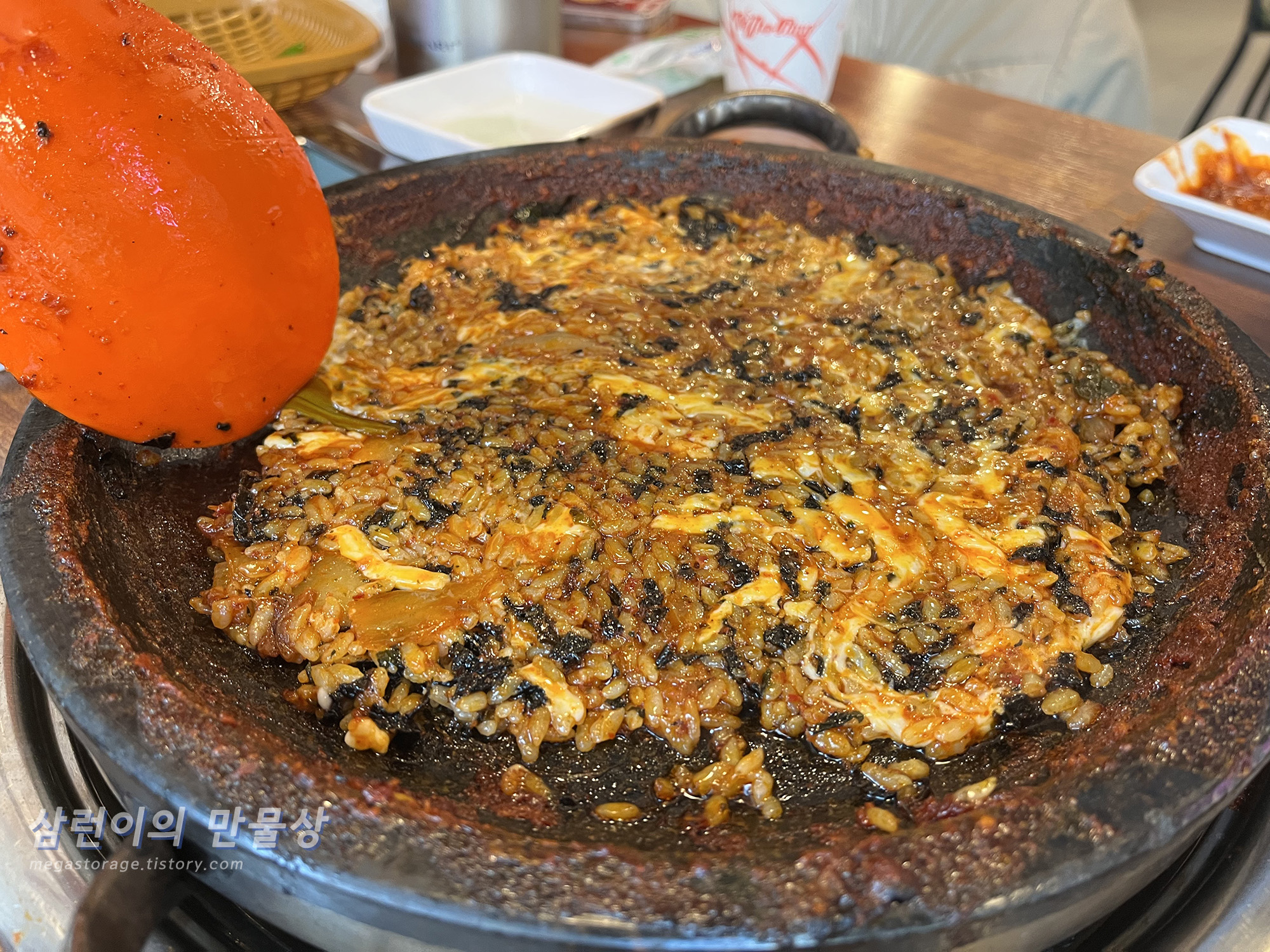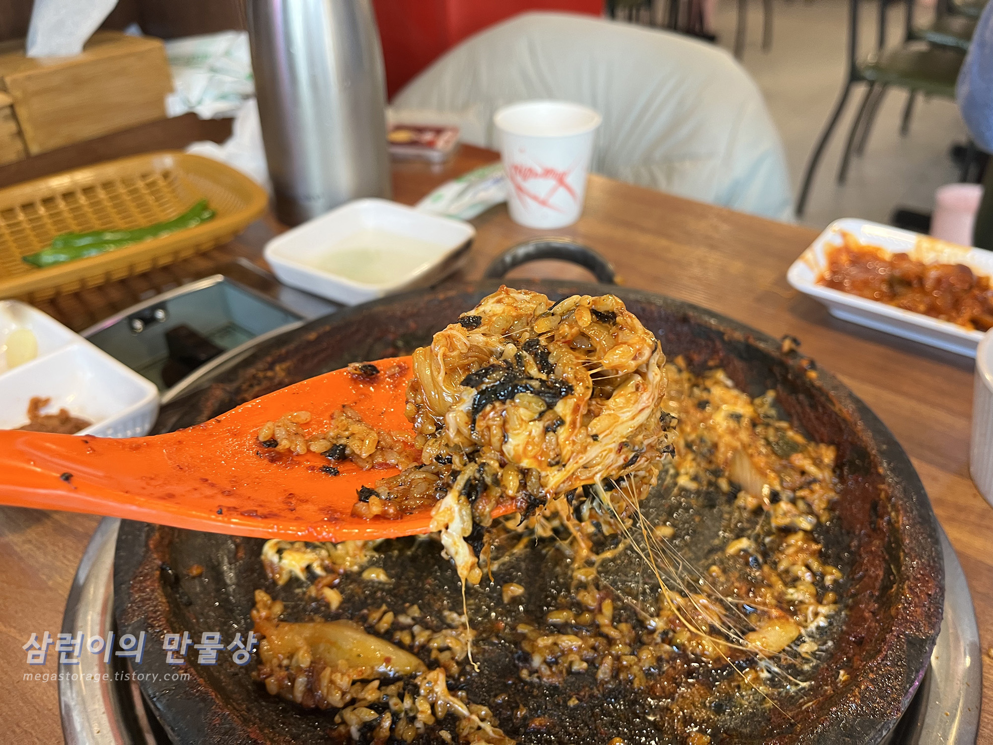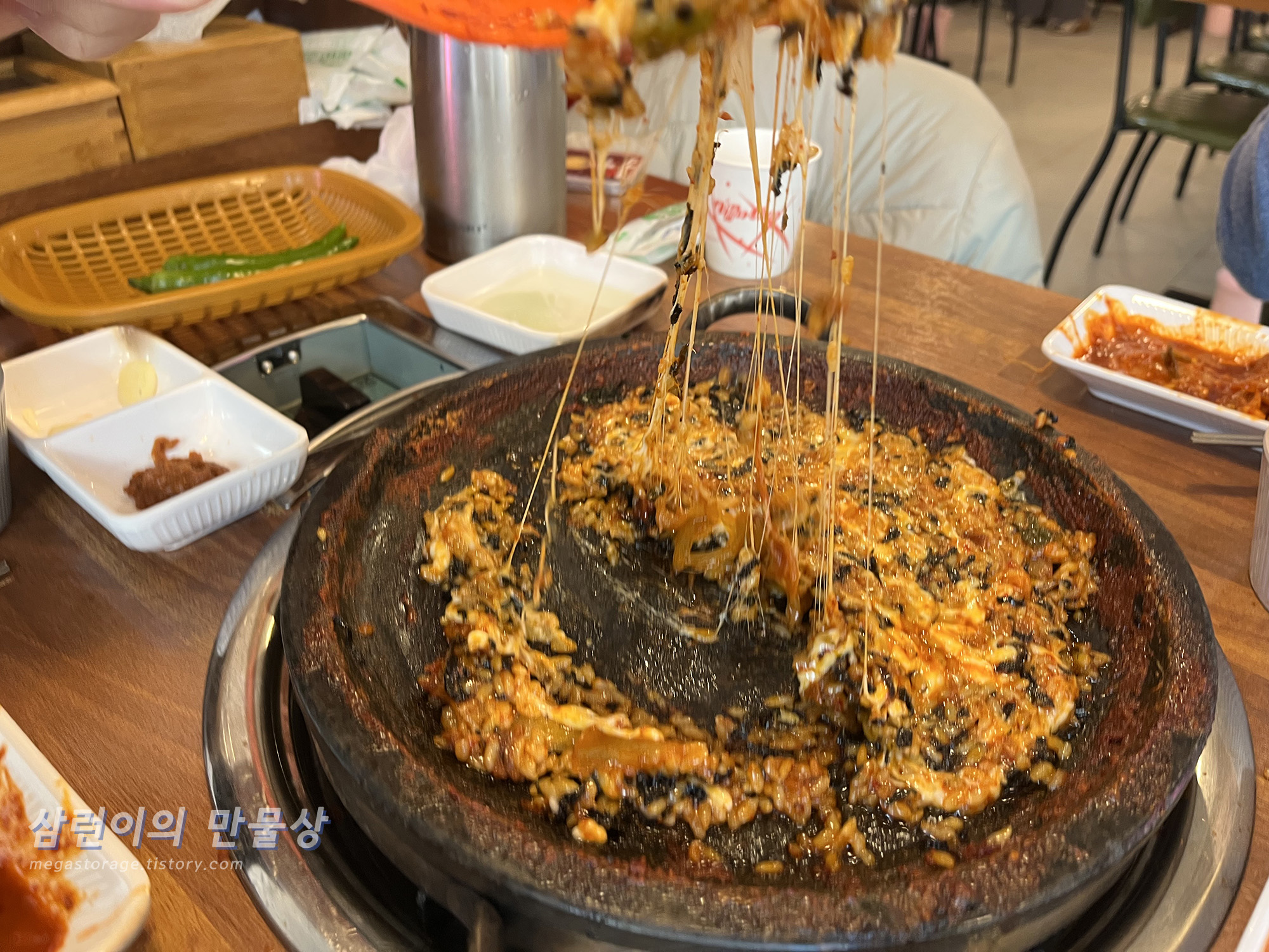 다 먹은 다음엔 밥을 볶아 먹을 수 있습니다. 밥은 추가로 시키거나, 일행의 공기밥 1개를 온전히 둔 후 볶아먹는 방법이 있습니다. 밥을 볶은 후 치즈를 뿌렸습니다.