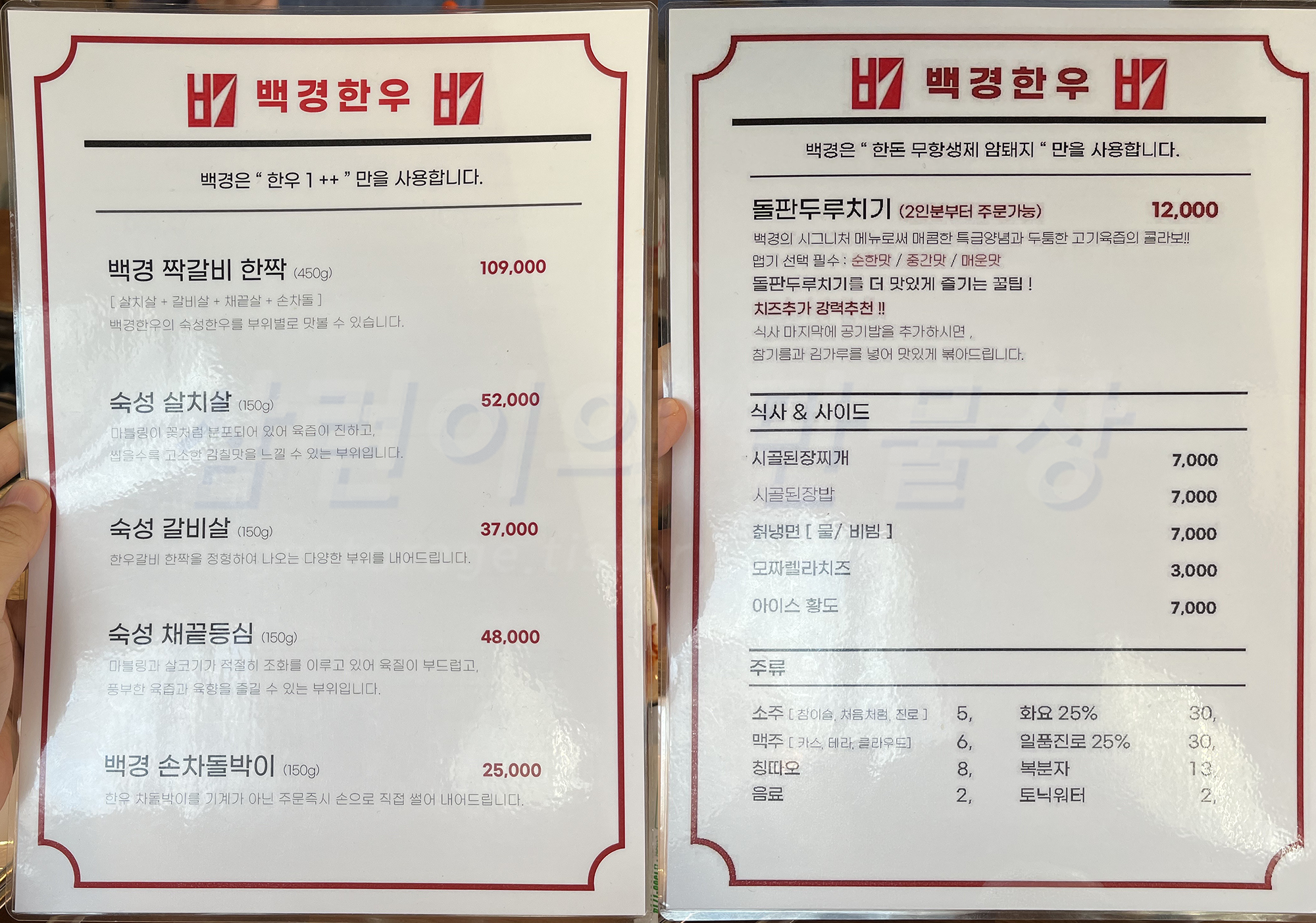 백경한우 판교본점 메뉴입니다. 좌측은 저녁 술자리 메뉴이며, 우측의 '돌판 두루치기'가 점심 메뉴입니다. 돌판 두루치기는 인당 12,000원인데 2인분 이상부터 주문 가능합니다. 여기에 '모짜렐라치즈'를 추가하면 완전 최고입니다.