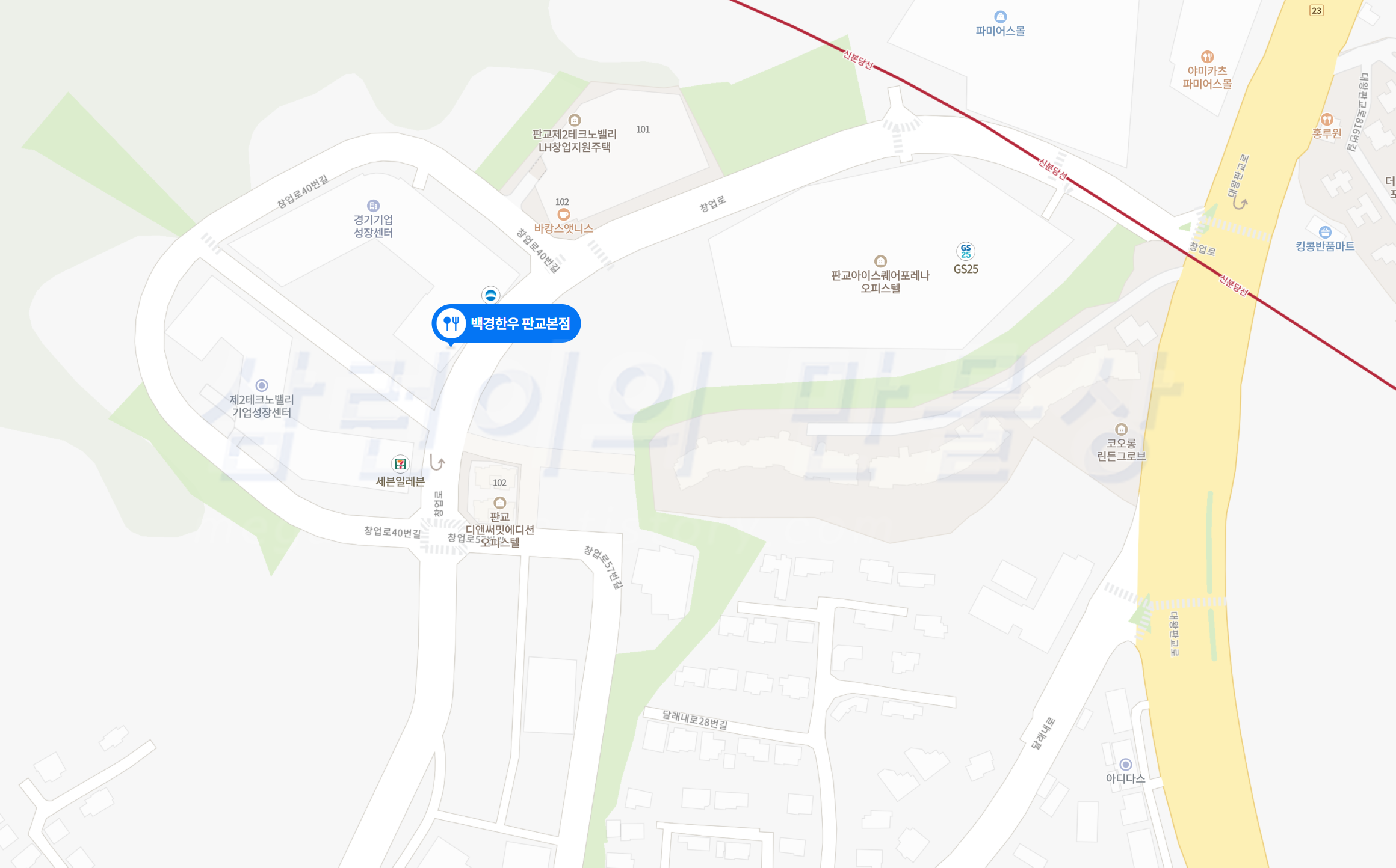 백경한우 판교본점은 '경기기업 성장센터' 건물의 지상층에 위치해있습니다. 도로 앞에서 보면 1층인데 주소상으론 지하1층이네요. 이곳은 두루치기가 정말 맛있습니다.