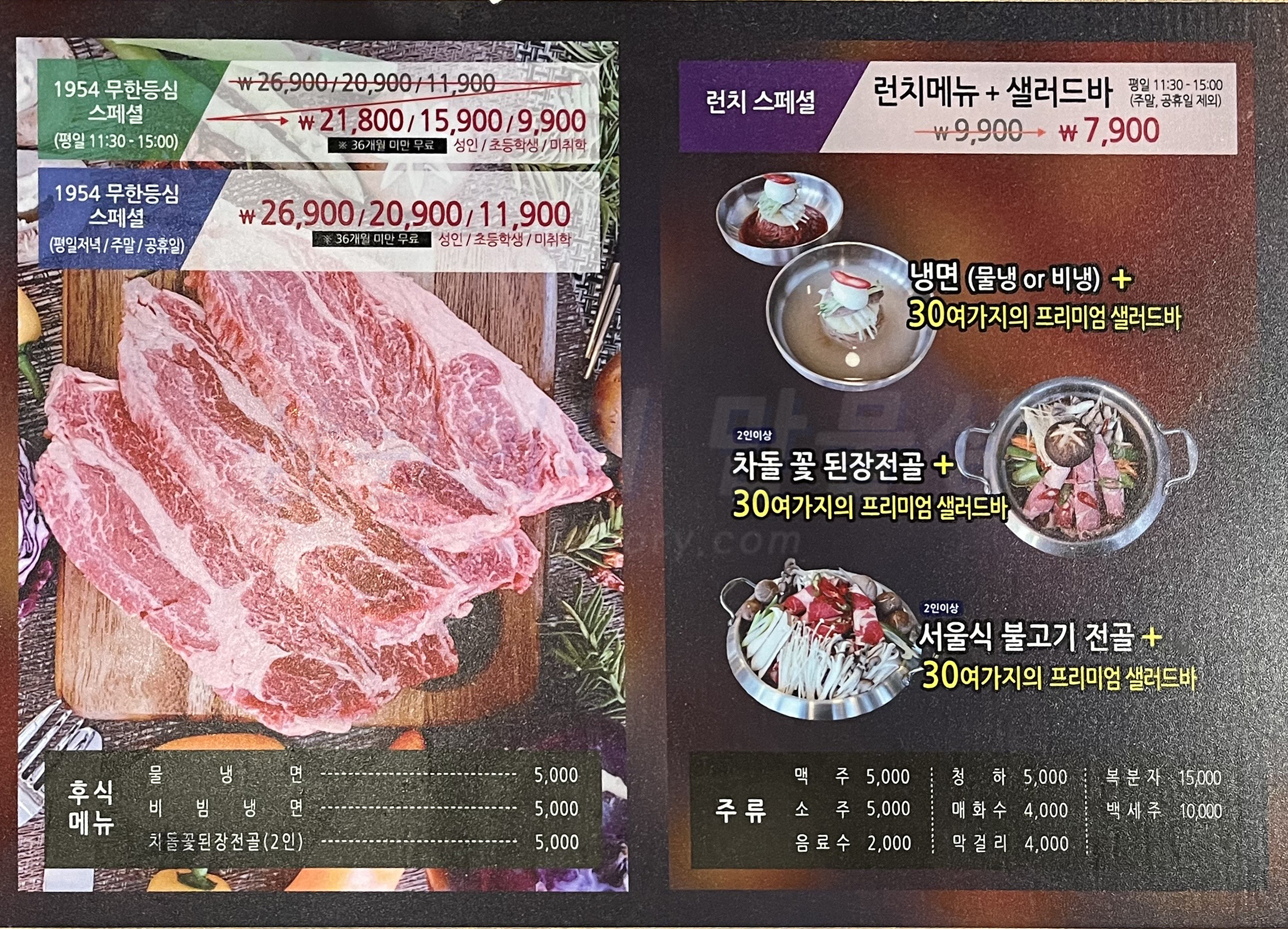평일 점심(11:30 ~ 15:00)엔 성인 기준으로 1인에 21,800원이지만 그 외 시간대는 성인 기준으로 1인에 26,900원 입니다. 물냉면, 비빔냉면 및 차돌꽃된장전골(2인 이상)도 판매하고 있습니다.
