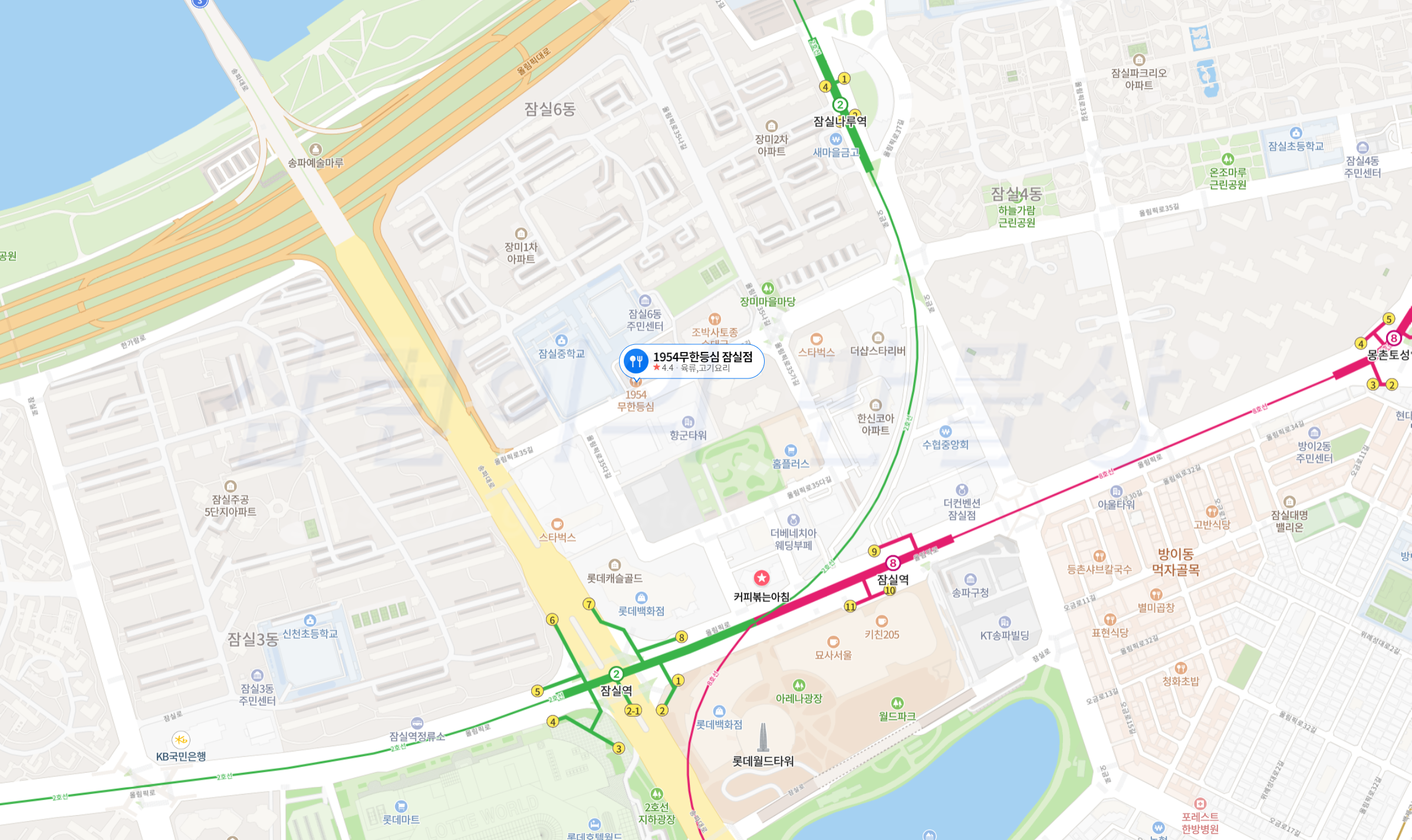 1954 무한등심 잠실점은 '잠실역 7번/8번/9번' 출구와 '잠실나루역 3번' 출구의 중간쯤에 위치합니다.