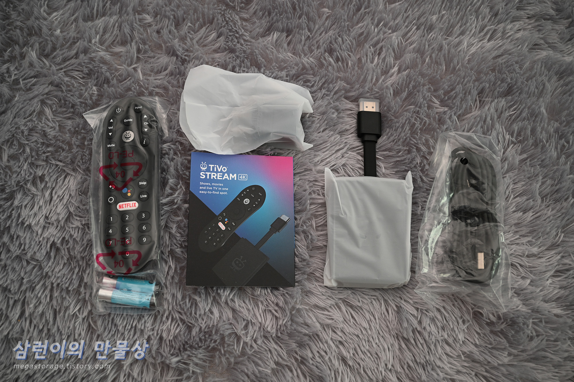 구성품입니다. 좌측부터 리모컨(건전지 포함), 충전기(상단), 사용자 매뉴얼, Tivo Stream 4K 본체 및 USB micro B타입 케이블입니다.