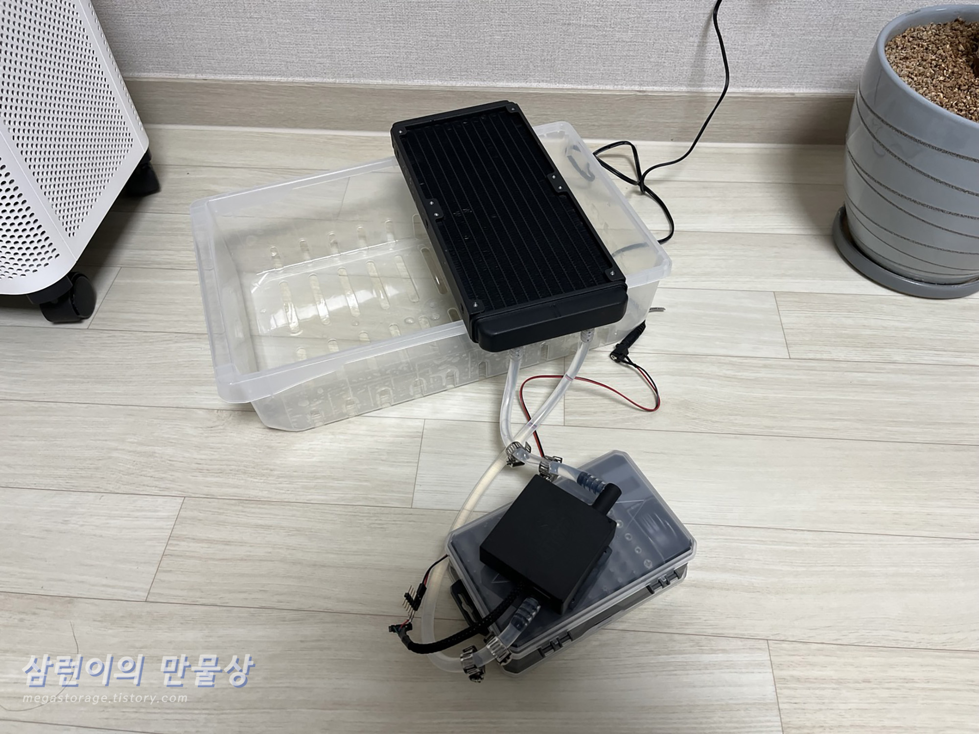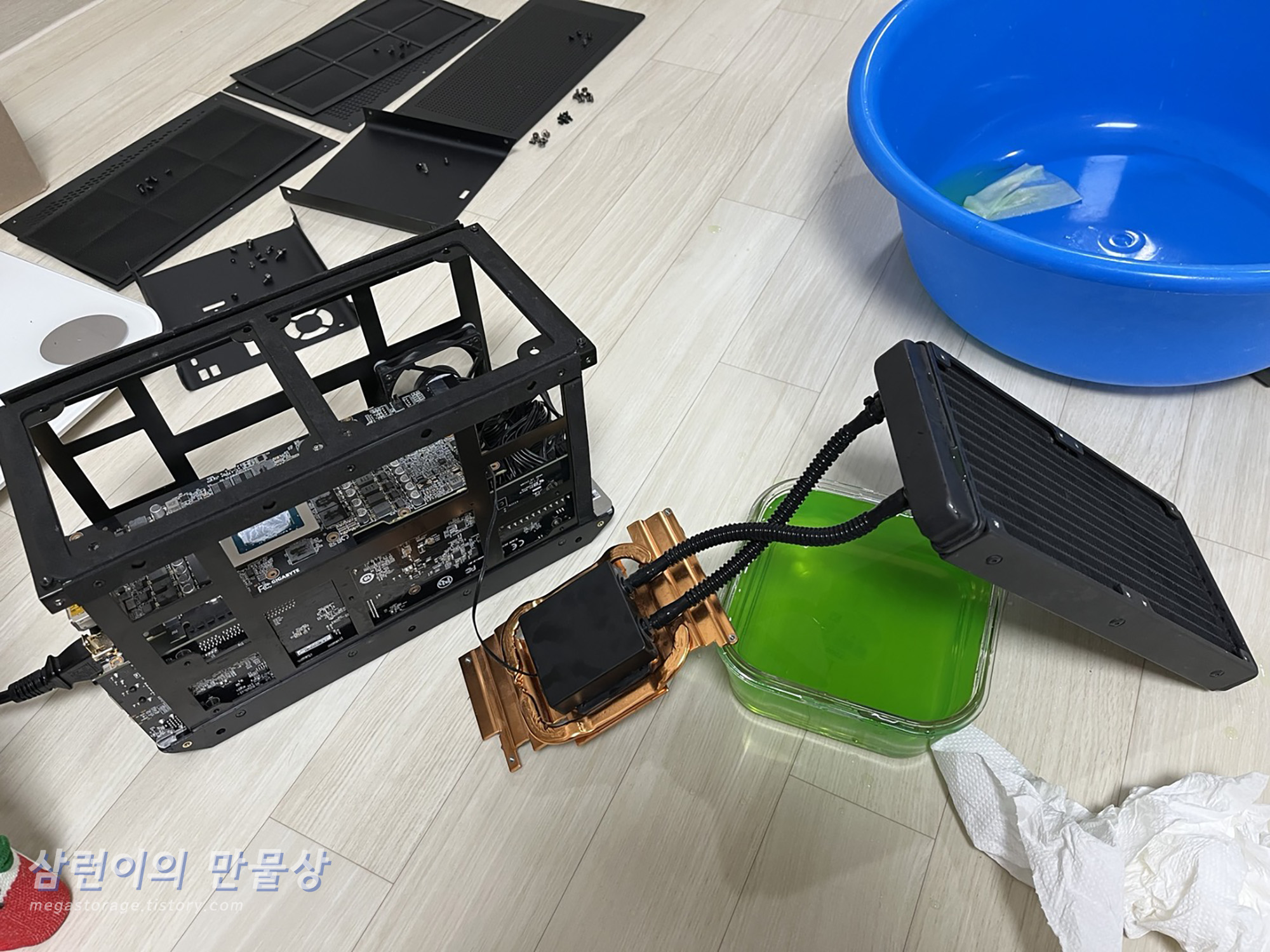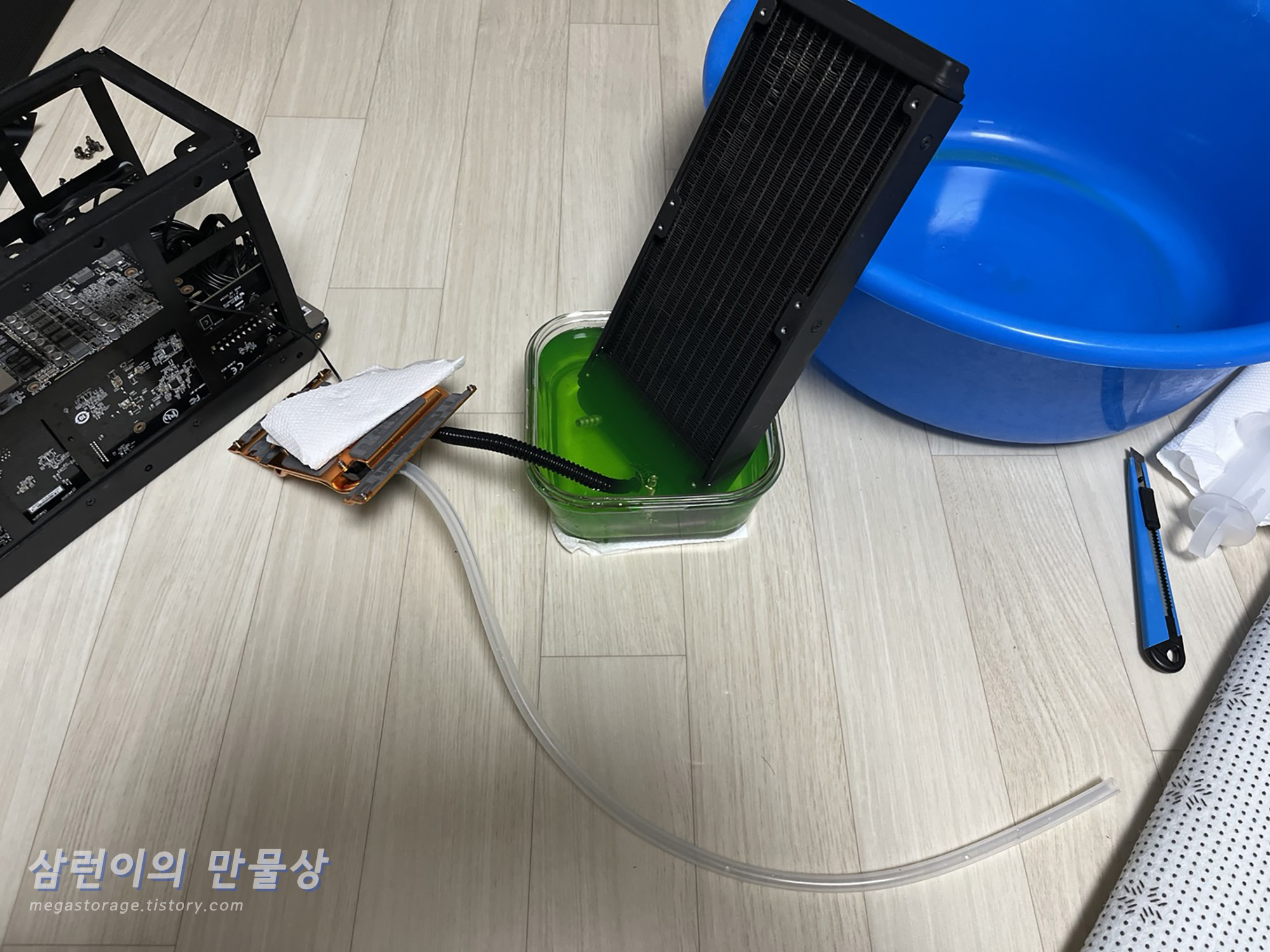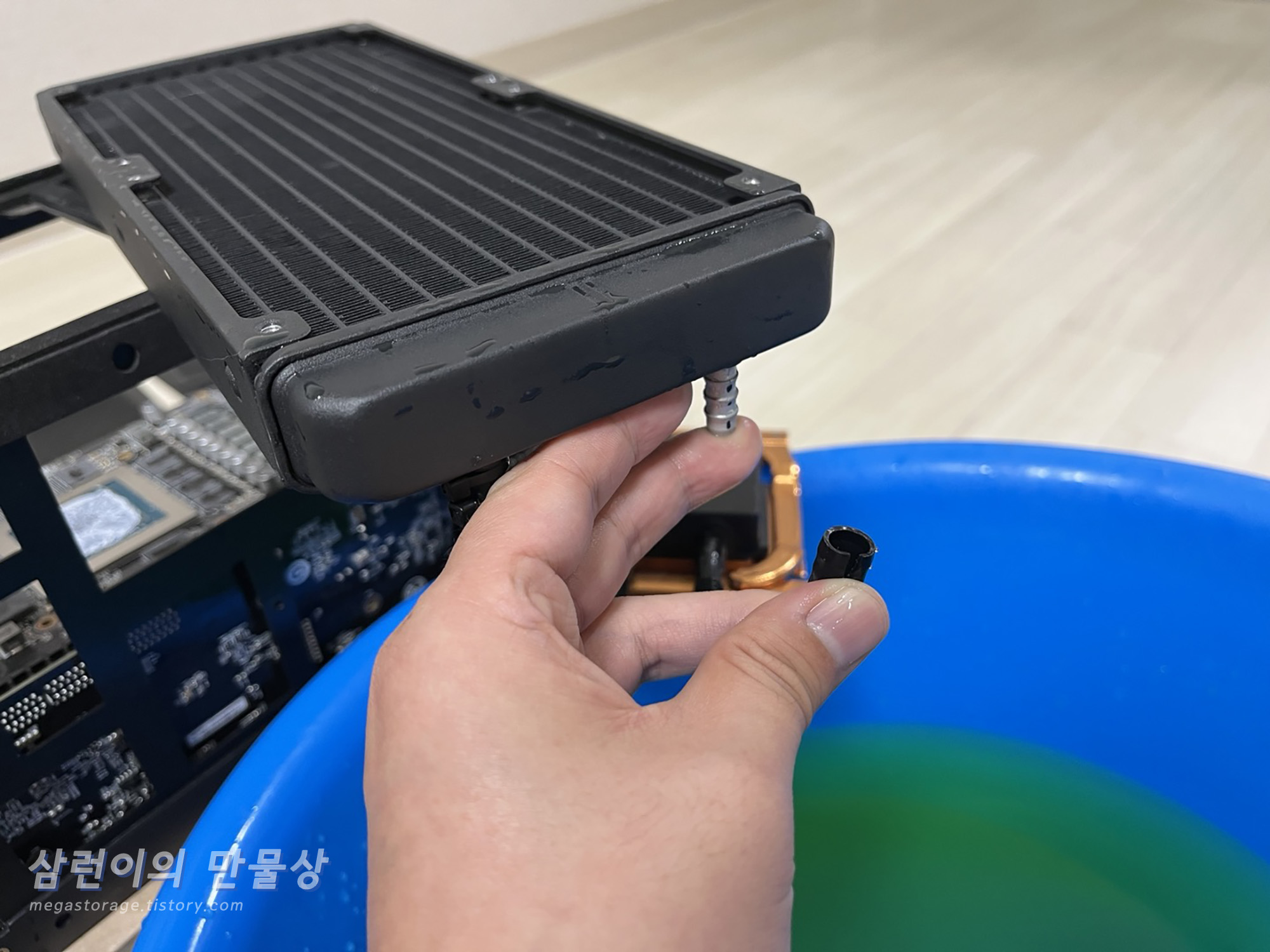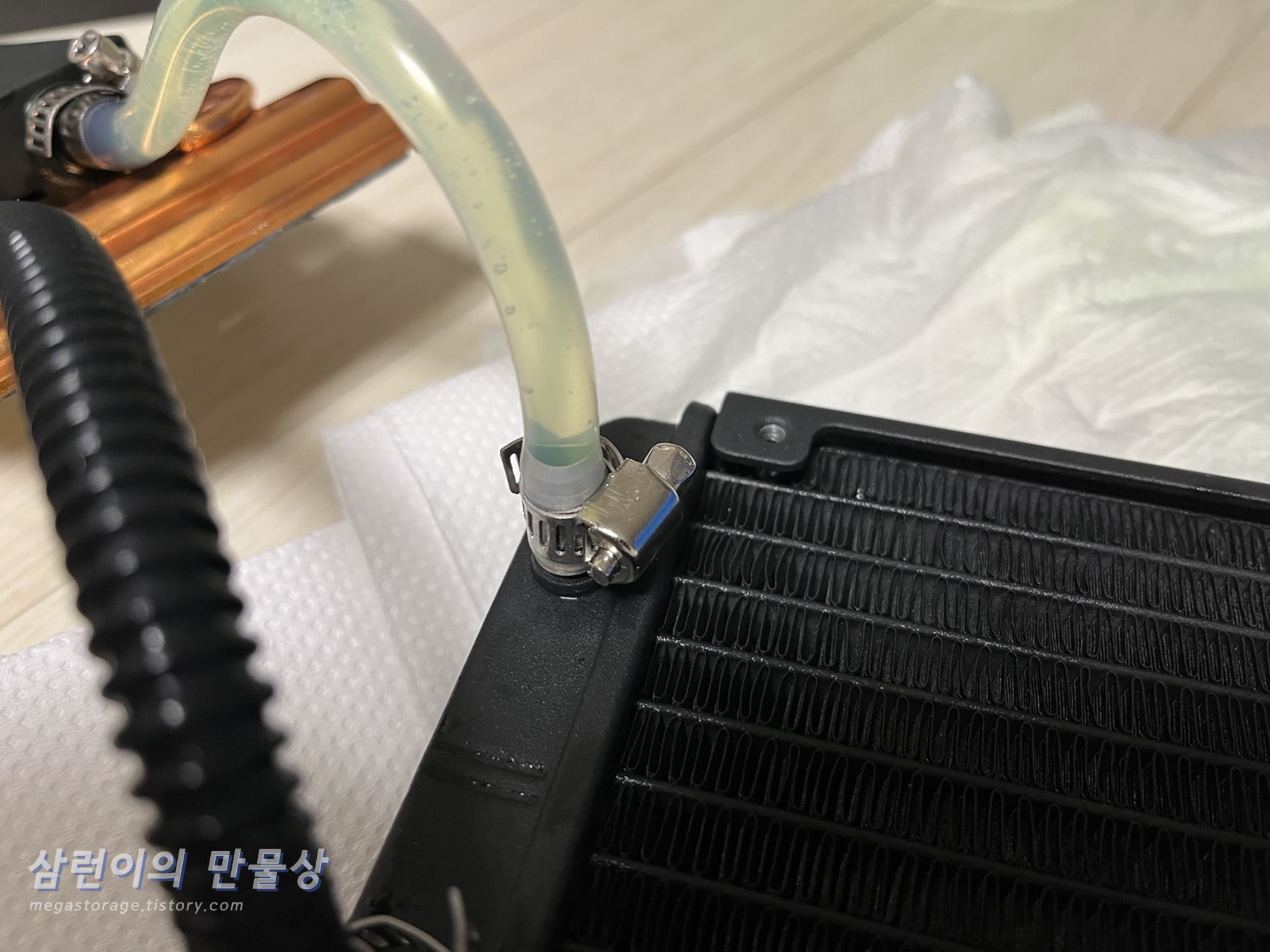 대충(...) 주입 및 고정을 한 후 가동 테스트를 하던 중.. 어? 냉각수가 샙니다. 바로 전원을 내리고 분해를 합니다. 힘듭니다. 저는 왜 이런 고생을 하고 있을까요?