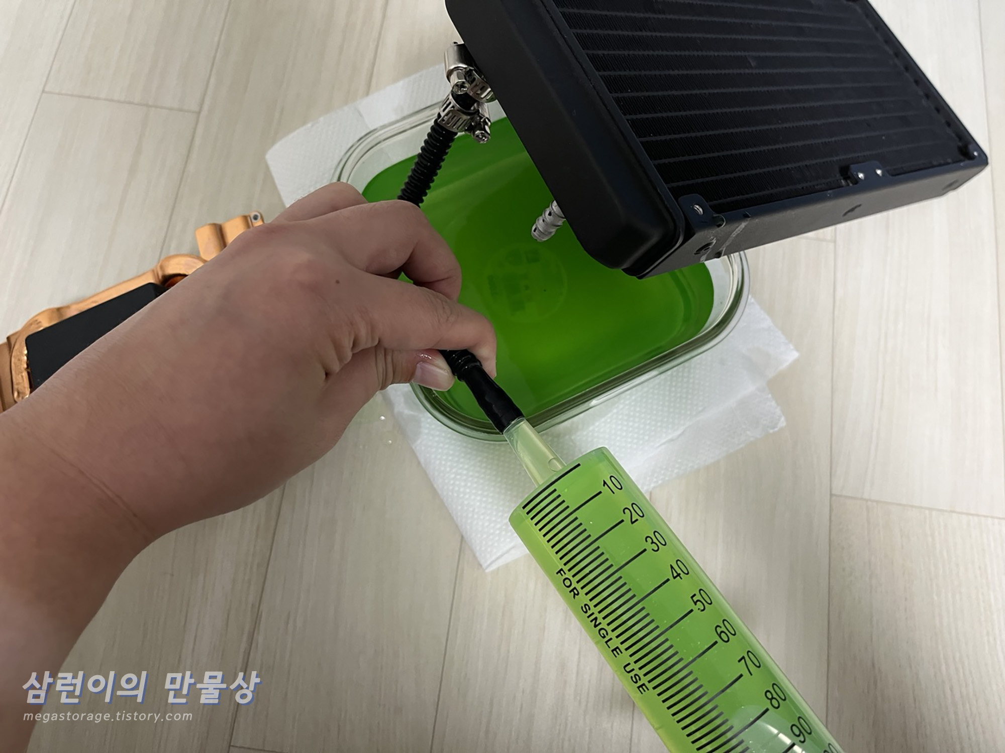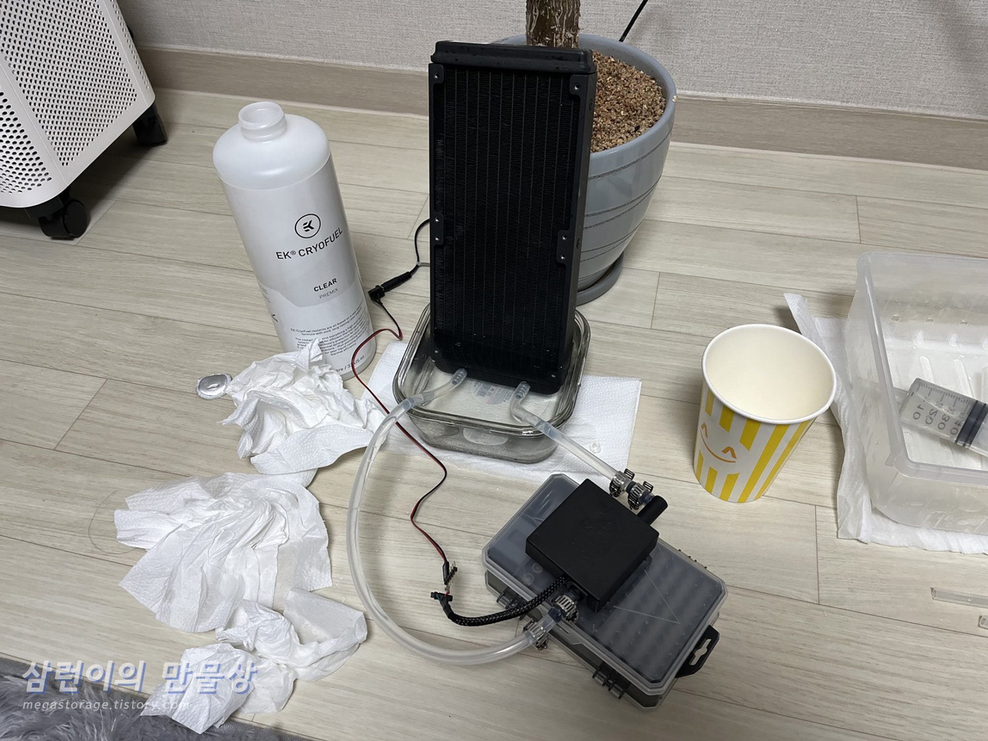 종이컵으로 냉각수를 다시 넣어보려고 했는데 잘 안 됐습니다. (참고로 이 당시엔 냉각수 교체 지식이 전무한 상태입니다) 원래 냉각수를 교체할 땐 라디에이터의 냉각수 출입구를, 냉각수에 담근 상태에서 주사기로 넣어줘야 합니다. 라디에이터와 펌프, 그리고 호스에 공기방울이 없어야 하거든요.
