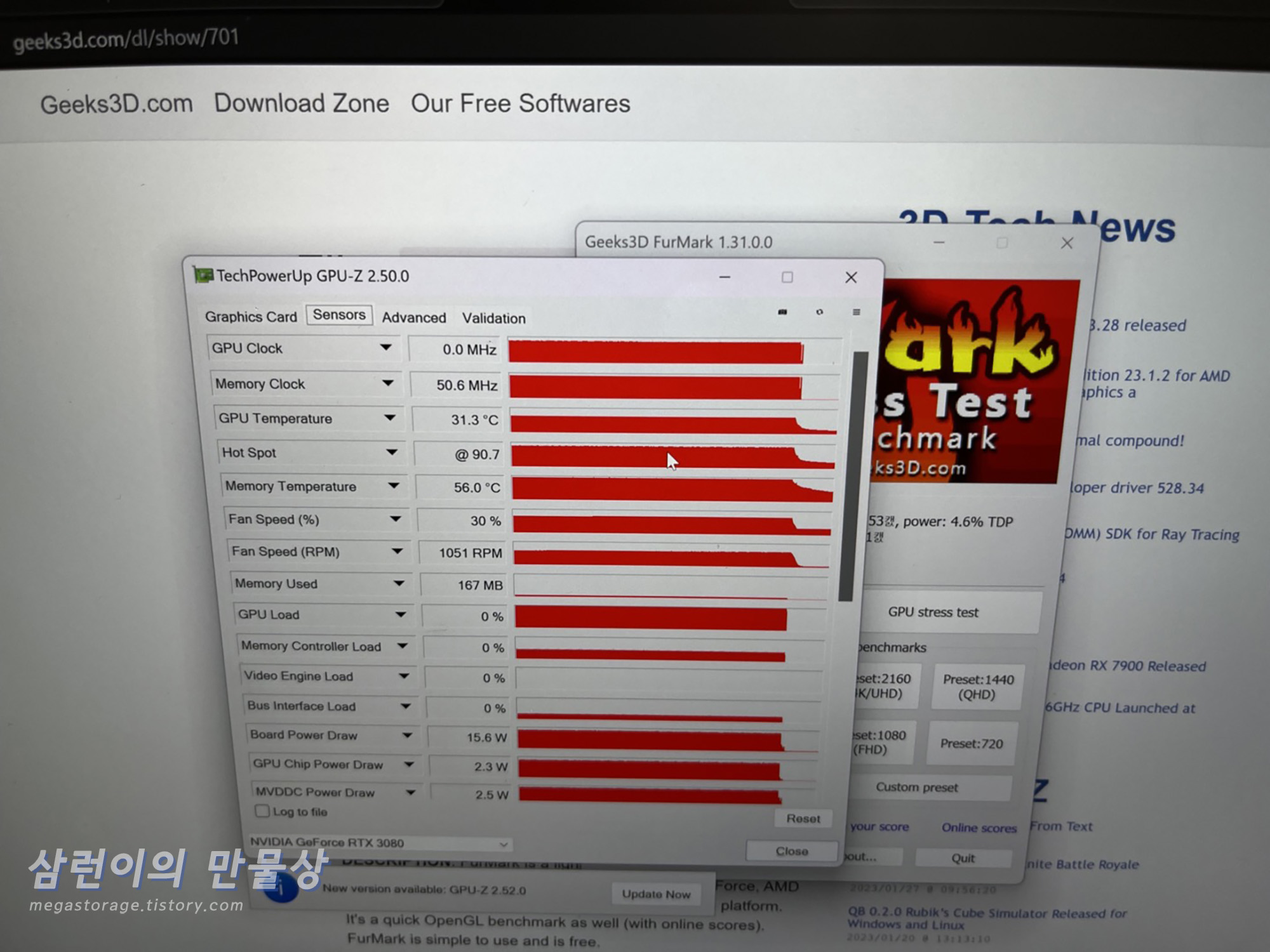 우측의 '최대'를 보시면 됩니다. GPU 온도 74도, 메모리 온도 96도, 핫스팟 온도 92도입니다. 겨울에 이 정도인데, 여름엔 실사용 불가입니다.
