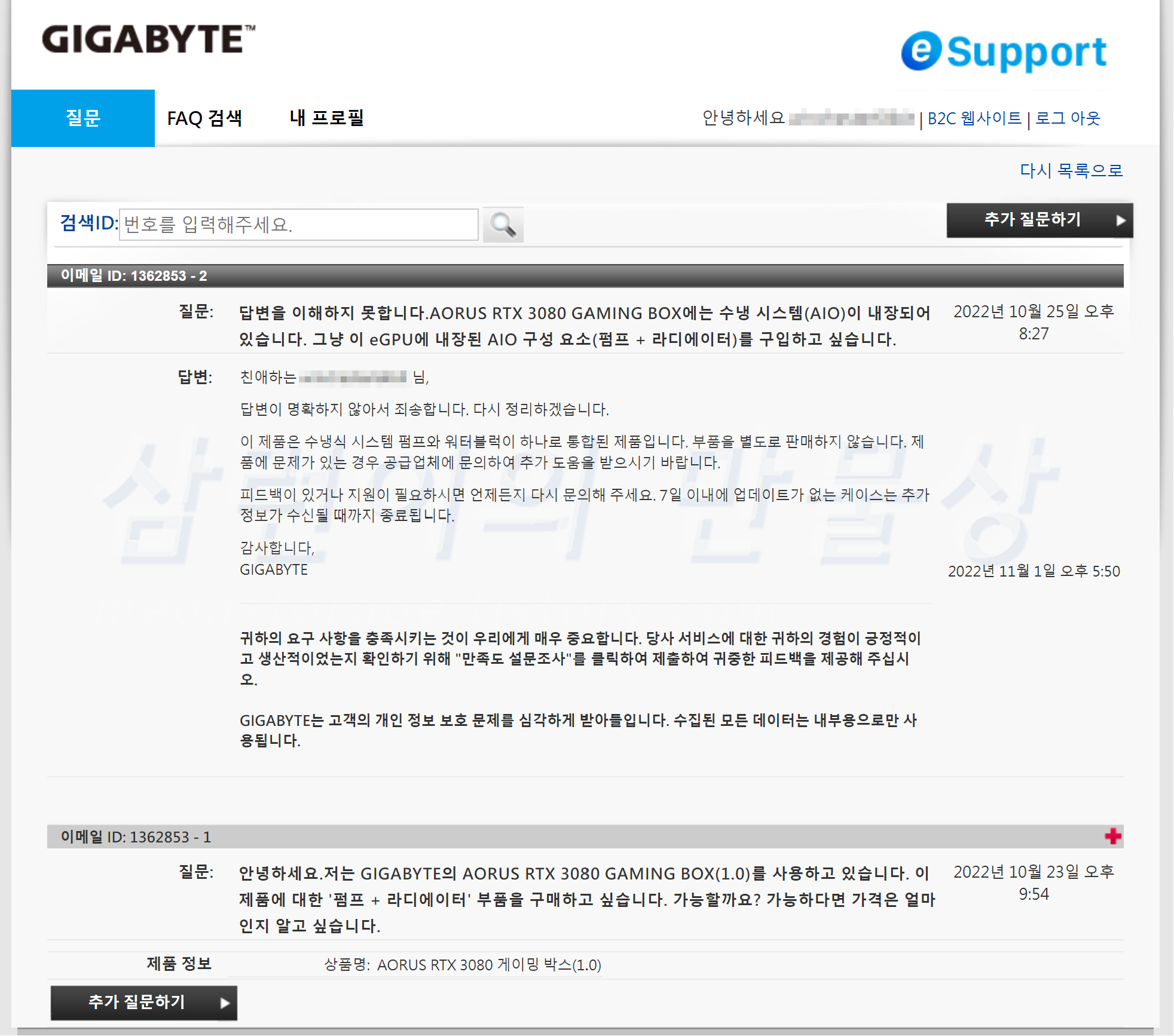 이런 펌프는 분명히 상용 제품에 사용되고 있을 것입니다. Gigabyte Aorus RTX 3080 GAMING BOX가 아닌 다른 제품에 쓰이고 있을 것입니다. 그런데 찾기가 매우 힘들었습니다. 누가 이런걸 직접 교체할까요.. 교체 하더라도 인터넷에 정보를 올려줄 사람은 없을듯.. 그래서 기가바이트 본사에 직접 문의했습니다.