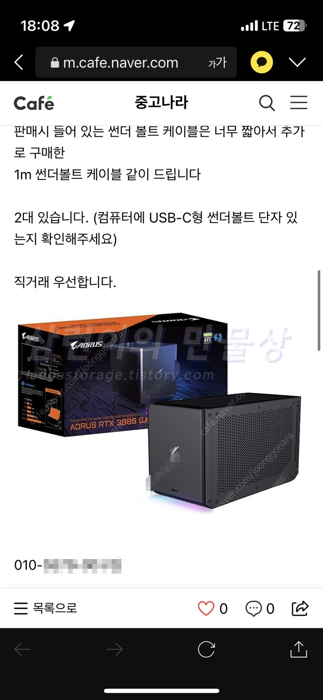 중고나라에 가서 Aorus RTX 3080 GAMING BOX 매물을 탐색했습니다. 때마침 집과 멀리 떨어지지 않은 8호선 남한산성역에서 거래 가능한 직거래 매물이 올라옵니다.