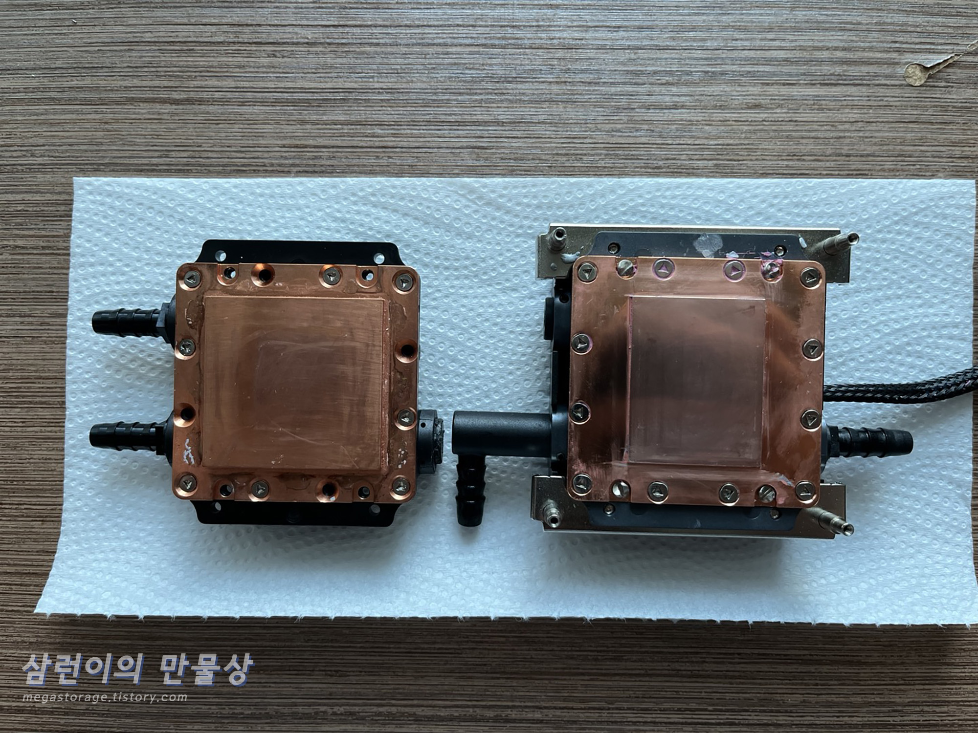 펌프의 내부가 드러났습니다. 좌측 펌프의 중앙 부분에서 냉각수가 배출되고, 우측의 방열핀 내부를 거쳐간 후, 우측 방열핀의 좌측 상단으로 나온 냉각수가, 좌측 펌프의 좌측 하단으로 빠져나갑니다.